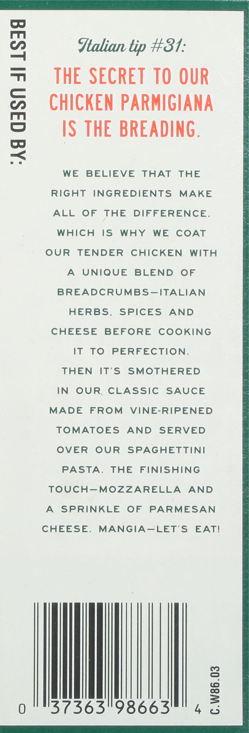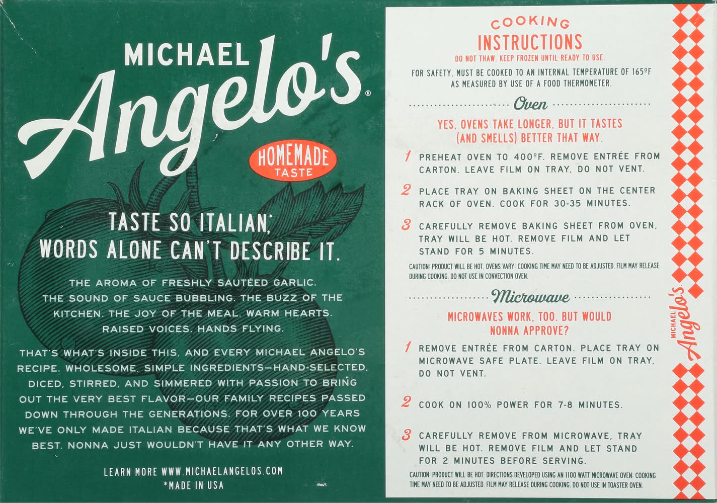 Do not thaw. keep frozen until ready to use. for safety. must be cooked to an internal temperature of 165 degrees f as measured by use of a food thermometer. oven: yes, ovens take longer, but it tastes (and smells) better that way. one: preheat oven to 400 degrees f. remove entree from cartoon. two: place tray on cookie sheet on center rack of oven (6-8 inch from heating element). cook with film on for 30-35 minutes. three: carefully remove entree from oven, remove film, and let stand for 2 minutes before serving. microwave: microwaves work, too. but would nonna approve? one: remove entree from carton. two: place tray in microwave with film on and cook for 7-8 minutes. three: carefully remove entree from microwave, remove film, and let stand for 2 minutes before serving. keep frozen & cook thoroughly.