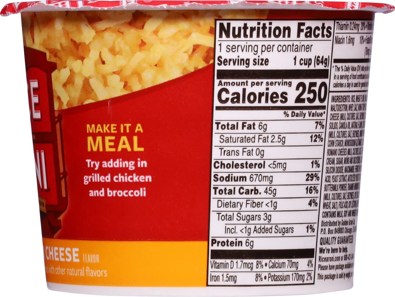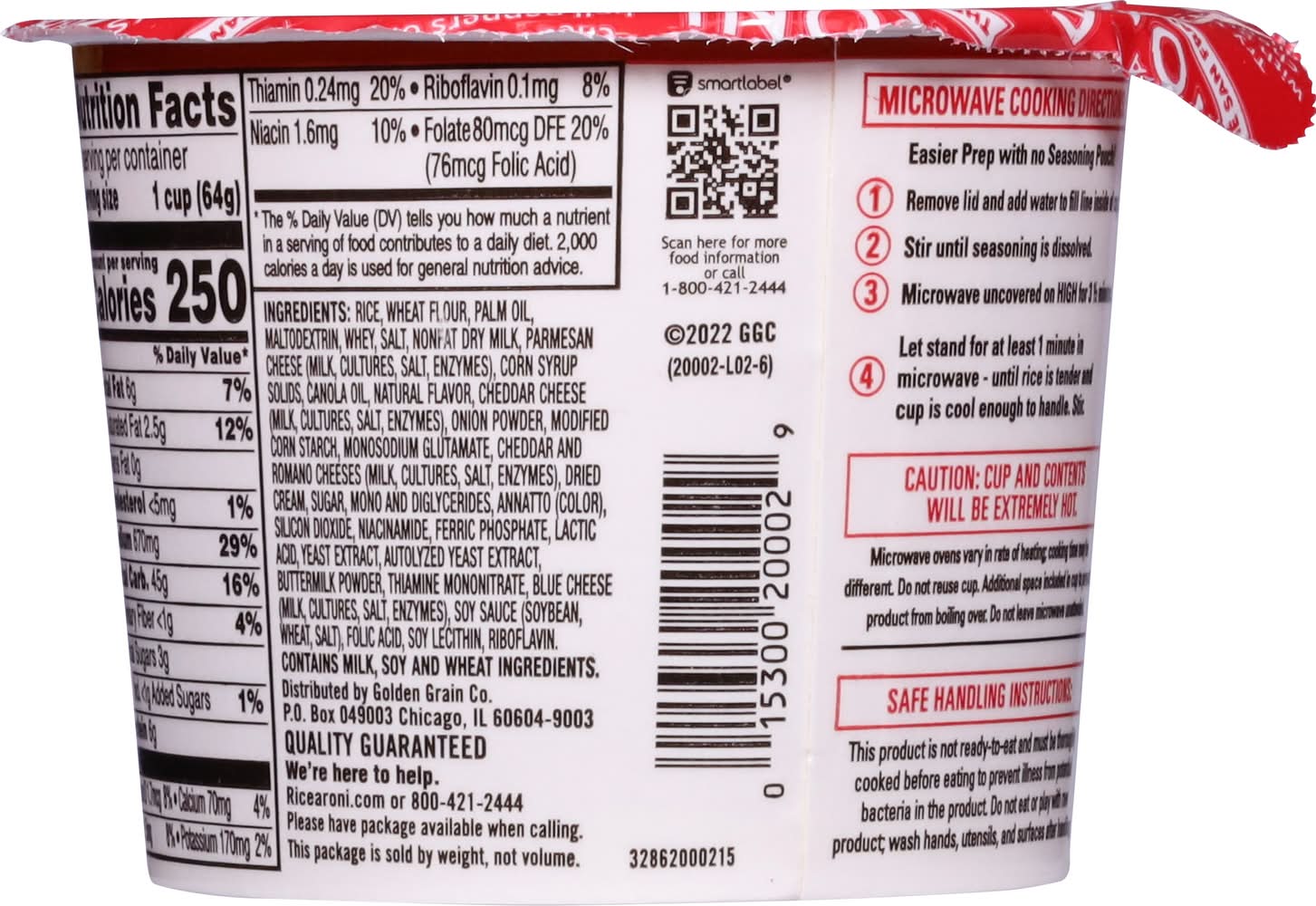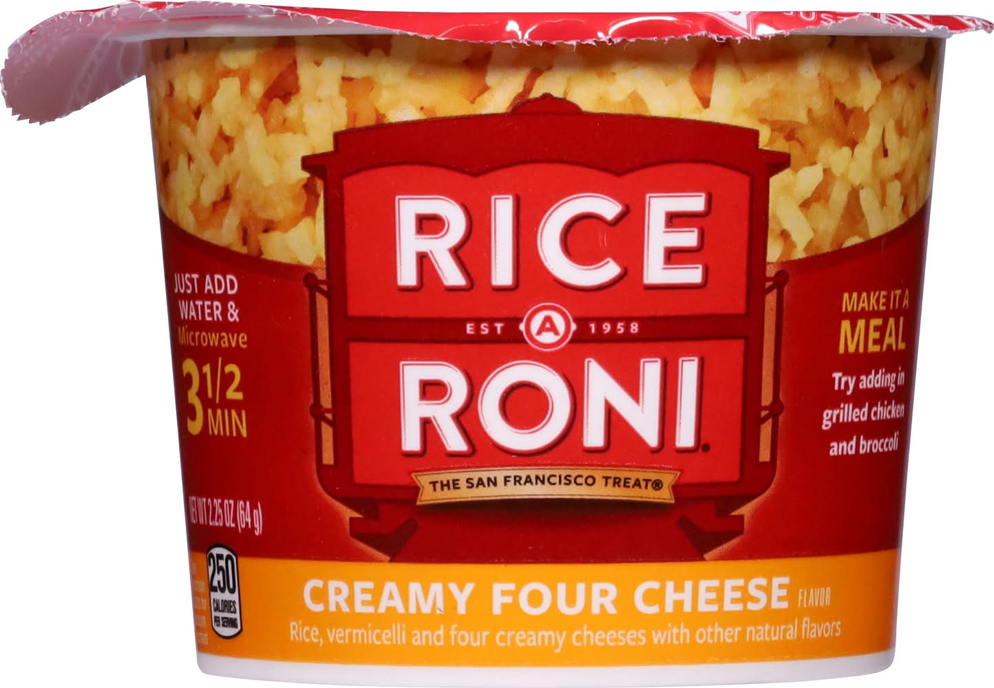 Est 1958. The San Francisco treat. Just add water & microwave 3-1/2 min. Cooks Just add water. This package is sold by weight, not volume. Quality guaranteed. • Flavor: Creamy four cheese • Size: 2.25 OZ • Golden Grain, P.O. Box 049003 , Chicago , IL , 60604-9003
