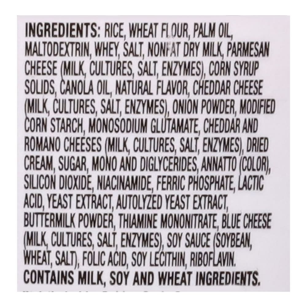 Ingredients: Rice, Wheat Flour, Palm Oil, Maltodextrin, Whey, Salt, Nonfat Dry Milk, Parmesan Cheese (Milk, Cultures, Salt, Enzymes), Corn Syrup Solids, Canola Oil, Natural Flavor, Cheddar Cheese (Milk, Cultures, Salt, Enzymes), Onion Powder, Modified Corn Starch, Monosodium Glutamate, Cheddar and Romano Cheeses (Milk, Cultures, Salt, Enzymes), Dried Cream, Sugar, Mono and Diglycerides, Annatto (Color), Silicon Dioxide, Niacinamide, Ferric Phosphate, Lactic Acid, Yeast Extract, Autolyzed Yeast Extract, Buttermilk Powder, Thiamine Mononitrate, Blue Cheese (Milk, Cultures, Salt, Enzymes), Soy Sauce (Soybean, Wheat, Salt), Folic Acid, Soy Lecithin, Riboflavin Contains: Milk, Soybeans, Wheat, Corn