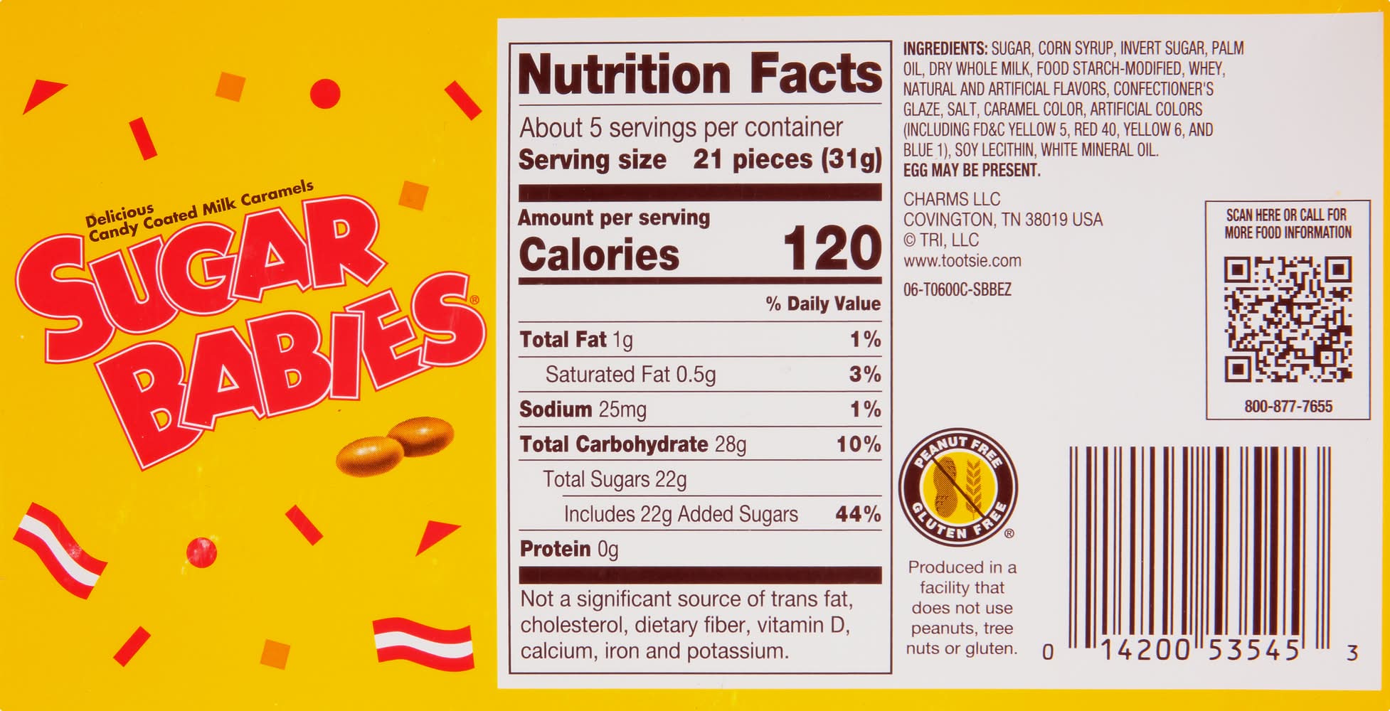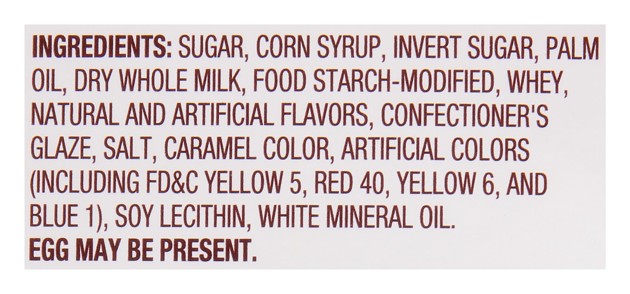 Ingredients: Sugar, Corn Syrup, Invert Sugar, Palm Oil, Dry Whole Milk, Food Starch-Modified, Whey, Natural and Artificial Flavors, Confectioner's Glaze, Salt, Caramel Color, Artificial Colors (Including FD&C Yellow 5, Red 40, Yellow 6, and Blue 1), Soy Lecithin, White Mineral Oil Contains: corn, Milk, Soybeans, Eggs