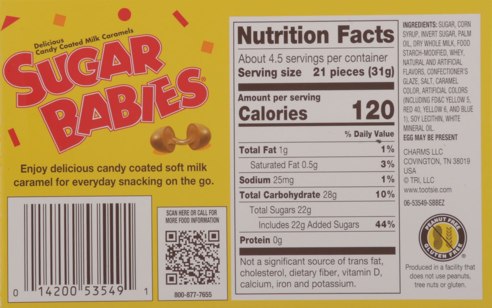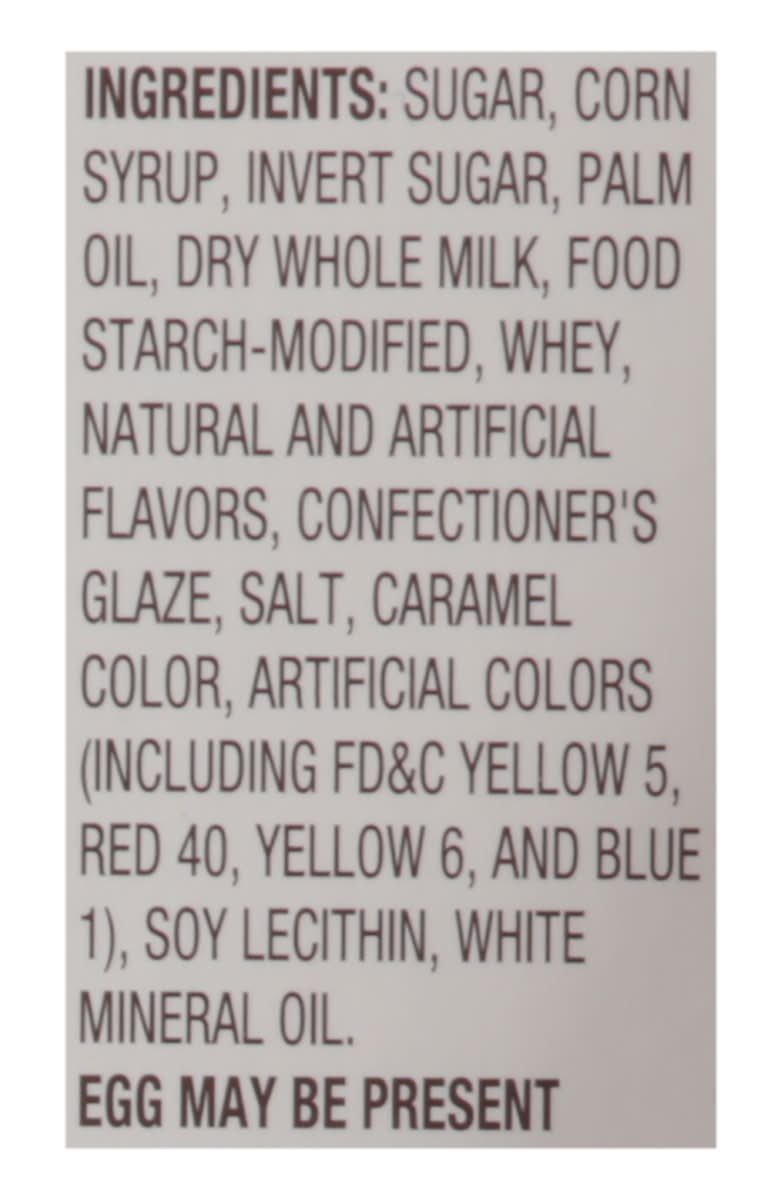 Ingredients: Sugar, Corn Syrup, Invert Sugar, Palm Oil, Dry Whole Milk, Food Starch-Modified, Whey, Natural and Artificial Flavors, Confectioner's Glaze, Salt, Caramel Color, Artificial Colors (Including FD&C Yellow 5, Red 40, Yellow 6, and Blue 1), Soy Lecithin, White Mineral Oil Contains: Corn, Milk, Soybeans, Eggs