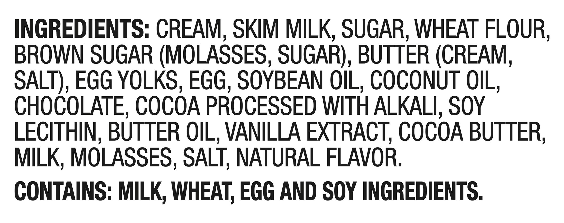 Ingredients: INGREDIENTS: CREAM; SKIM MILK; SUGAR; WHEAT FLOUR; BROWN SUGAR (MOLASSES; SUGAR); BUTTER (CREAM; SALT); EGG YOLKS; EGG; SOYBEAN OIL; COCONUT OIL; CHOCOLATE; COCOA PROCESSED WITH ALKALI; SOY LECITHIN; BUTTER OIL; VANILLA EXTRACT; COCOA BUTTER; MILK; MOLASSES; SALT; NATURAL FLAVOR Contains: Tree Nuts, Soybeans, Wheat, Milk, Eggs