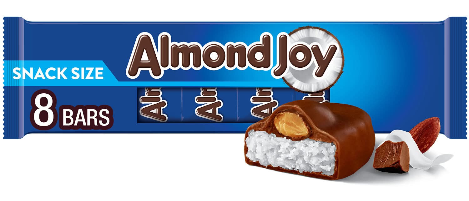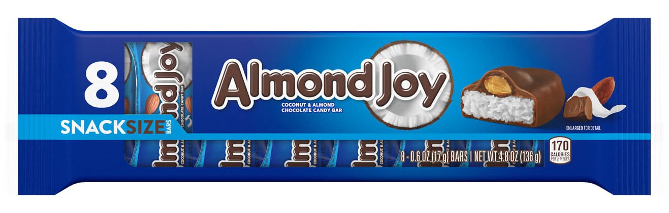 Island time is all the time when you take a bite of a snack size ALMOND JOY chocolate candy bar. When you need a break from the weekday craze, escape into a paradise of bliss when you bite into a delicious fusion of creamy chocolate candy, sweet coconut and whole almonds. It's the perfect treat to eat wherever life takes you. No doubt, it's an ALMOND JOY candy bar! Indulging in this sweet combination is the perfect way to relax during the workplace craze or throughout an eventful weekend. Unwrap a snack size ALMOND JOY chocolate candy for yourself or spread the joy with some of your favorite people. If you're in the kitchen baking, stock up on a handful of coconut candy bars and incorporate them into your brownies, cake batter, and cookies. Chop a few coconut chocolate candy bars up and mix them into your bowl to create a chewy brownie with a slight crunch and coconutty surprise. Or bring a little joy to the office by leaving this tropical treat in the breakroom. During the holidays, elevate your gifting by adding these delicious treats to Valentine's Day gift bag, springtime Easter baskets, Halloween candy bowls and festive Christmas stockings for everyone you love. • Pack size: 8 • Size: 2.4 OZ • The Hershey Company, Hershey, PA, 17033-0815