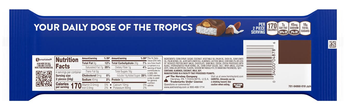 Ingredients: CORN SYRUP, SUGAR, COCONUT, VEGETABLE OIL (PALM OIL, SHEA OIL, SUNFLOWER OIL, PALM KERNEL OIL, /OR SAFFLOWER OIL), ALMONDS, LACTOSE (MILK), CONTAINS 2% OR LESS OF: REDUCED PROTEIN WHEY (MILK), CHOCOLATE, SKIM MILK, COCOA, COCOA PROCESSED WITH ALKALI, HYDROGENATED PALM KERNEL OIL, CORN SYRUP SOLIDS, SALT, WHEY (MILK), LECITHIN (SOY), VANILLIN (ARTIFICIAL FLAVOR), SODIUM METABISULFITE (TO MAINTAIN FRESHNESS), . Contains: Contains: Coconut|Almonds|Soy|Milk