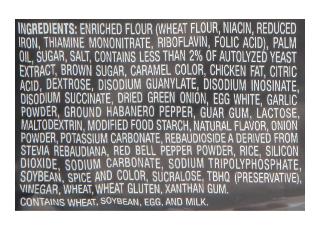 Ingredients: Enriched Flour (Wheat Flour, Niacin, Reduced Iron, Thiamine Mononitrate, Riboflavin, Folic Acid), Palm Oil, Sugar, Salt, Contains Less than 2% of Autolyzed Yeast Extract, Brown Sugar, Caramel Color, Chicken Fat, Citric Acid, Dextrose, Disodium Guanylate, Disodium Inosinate, Disodium Succinate, Dried Green Onion, Egg White, Garlic Powder, Ground Habanero Pepper, Guar Gum, Lactose, Maltodextrin, Modified Food Starch, Natural Flavor, Onion Powder, Potassium Carbonate, Rebaudioside a Derived from Stevia Rebaudiana, Red Bell Pepper Powder, Rice, Silicon Dioxide, Sodium Carbonate, Sodium Tripolyphosphate, Soybean, Spice and Color, Sucralose, TBHQ (Preservative), Vinegar, Wheat, Wheat Gluten, Xanthan Gum Contains: Wheat, Soybeans, Eggs, Milk, Lactose, Gluten, Peanuts, Tree Nuts, Sesame, Crustacean Shellfish, Fish