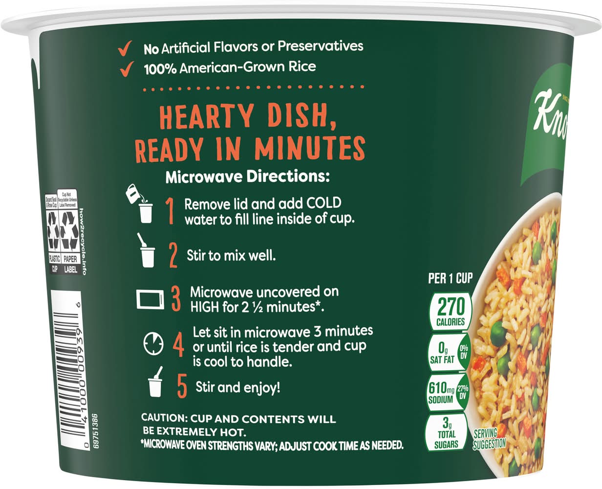 Hearty dish, ready in minutes. microwave directions: 1 remove lid and add cold water to fill line inside of cup. 2. stir to mix well. 3. microwave uncovered on high for 2-1/2 minutes (microwave oven strengths vary; adjust cook time as needed). 4. let sit in microwave 3 minutes or until rice is tender and cup is cool to handle. 5. stir and enjoy! caution: cup and contents will be extremely hot.