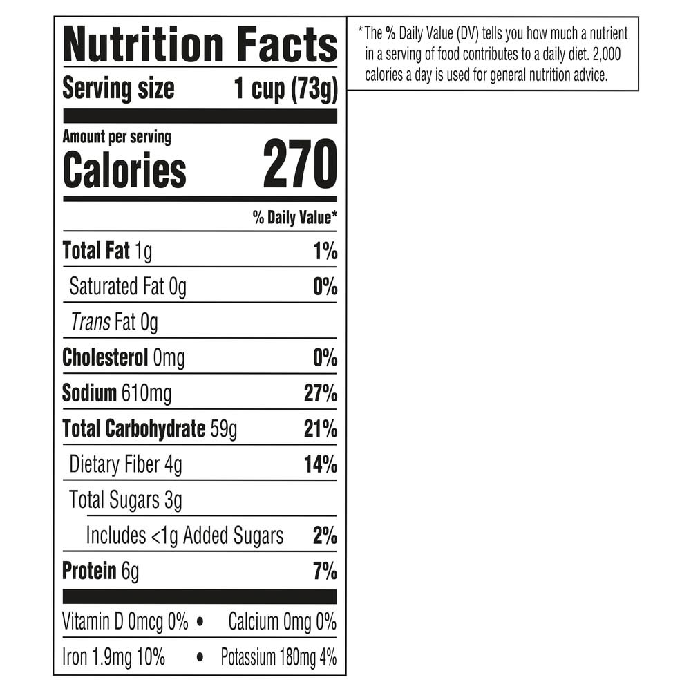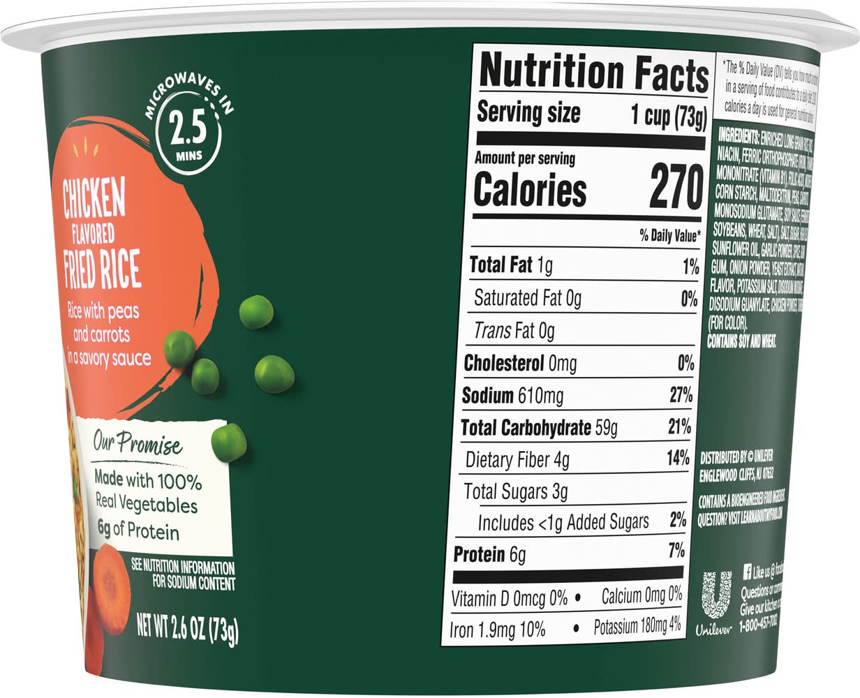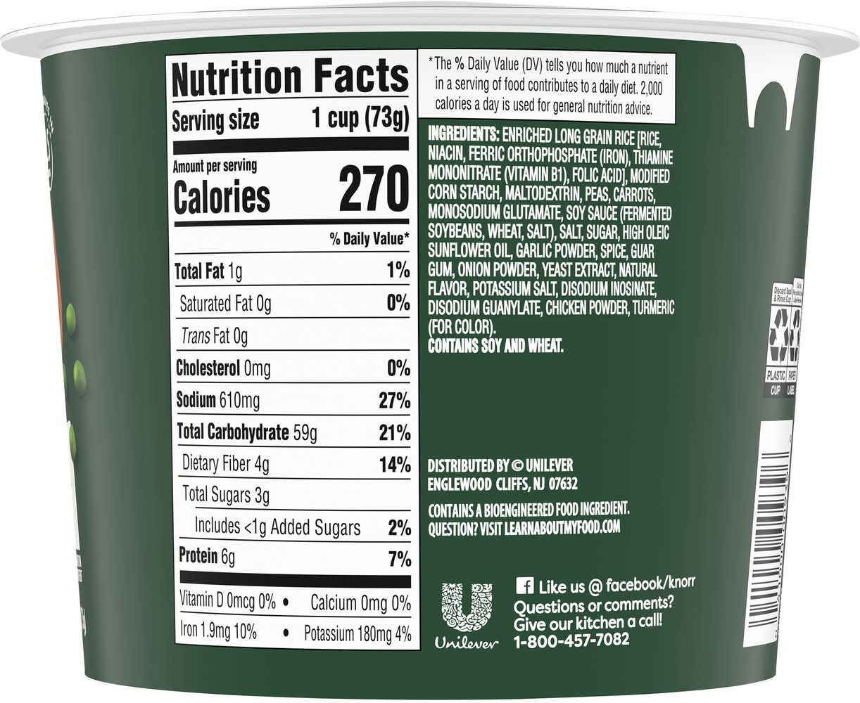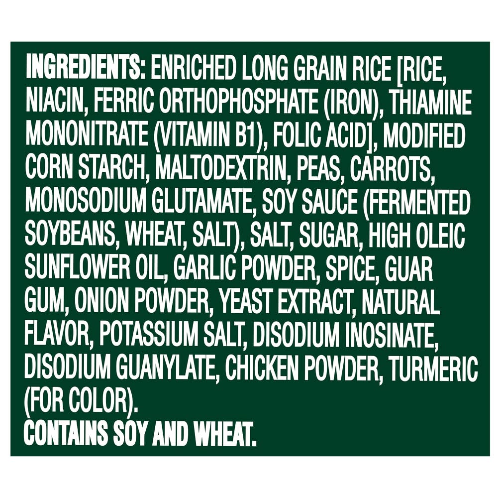 Ingredients: Enriched Long Grain Rice [Rice, Niacin, Ferric Orthophosphate (Iron), Thiamine Mononitrate (Vitamin B1), Folic Acid], Modified Corn Starch, Maltodextrin, Peas, Carrots, Monosodium Glutamate, Soy Sauce (Fermented Soybeans, Wheat, Salt), Salt, Sugar, High Oleic Sunflower Oil, Garlic Powder, Spice, Guar Gum, Onion Powder, Yeast Extract, Natural Flavor, Potassium Salt, Disodium Inosinate, Disodium Guanylate, Chicken Powder, Turmeric (for Color) Contains: Soybeans, Wheat, Corn