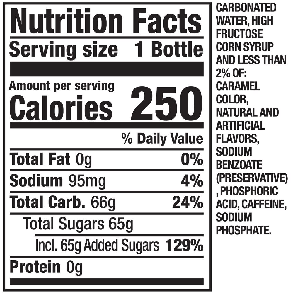 Ingredients: Carbonated Water, High Fructose Corn Syrup and Less than 2% of: Caramel Color, Natural and Artificial Flavors, Sodium Benzoate (Preservative), Phosphoric Acid, Caffeine, Sodium Phosphate. Contains: Corn Contains 68mg of caffeine