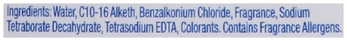 Ingredients: Water, C10-16 Alketh, Benzalkonium Chloride, Fragrance, Sodium Tetraborate Decahydrate, Tetrasodium EDTA, Colorants