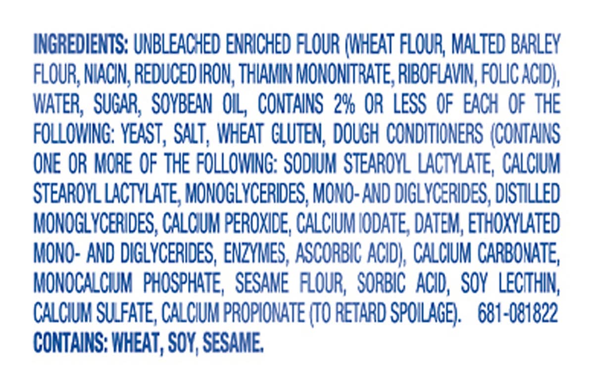 Ingredients: Unbleached Enriched Flour (Wheat Flour, Malted Barley Flour, Niacin, Reduced Iron, Thiamin Mononitrate, Riboflavin, Folic Acid), Water, Sugar, Soybean Oil, Contains 2% or Less of Each of the Following: Yeast, Salt, Wheat Gluten, Dough Conditioners (Contains One or More of the Following: Sodium Stearoyl Lactylate, Calcium Stearoyl Lactylate, Monoglycerides, Mono-and Diglycerides, Distilled Monoglycerides, Calcium Peroxide, Calcium Iodate, DATEM, Ethoxylated Mono- and Diglycerides, Enzymes, Ascorbic Acid), Calcium Carbonate, Monocalcium Phosphate, Sesame Flour, Sorbic Acid, Soy Lecithin, Calcium Sulfate, Calcium Propionate (to Retard Spoilage) Contains: Wheat, Soybeans, Sesame, Barley, Gluten