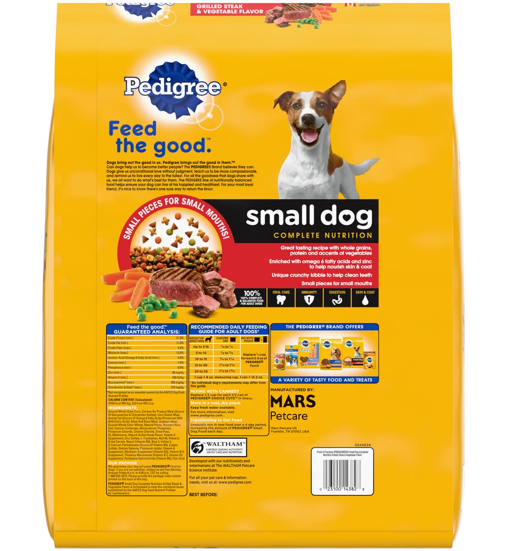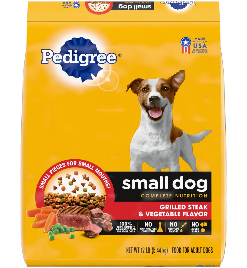 Even little dogs need a large amount of nutrition. That's why every bag of PEDIGREE Small Dog Grilled Steak & Vegetable Flavor Dry Dog Food has the vitamins and minerals small breed dogs need to be healthy and happy. Made with high quality whole grains, protein and omega-6 fatty acids, PEDIGREE Small Dog Food helps your canine look and feel their best. Best of all, our oral care kibble gently cleans their teeth with every bite. No high fructose corn syrup, no artificial flavors, and no added sugar. Size: 12 LB