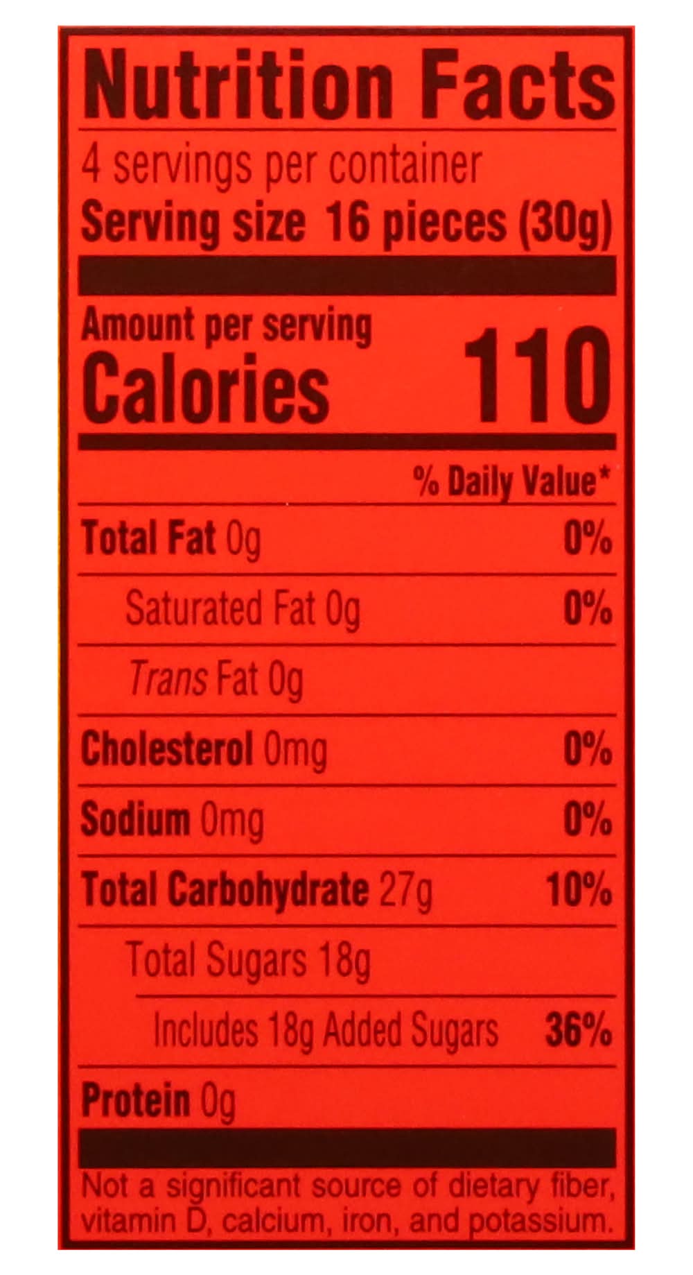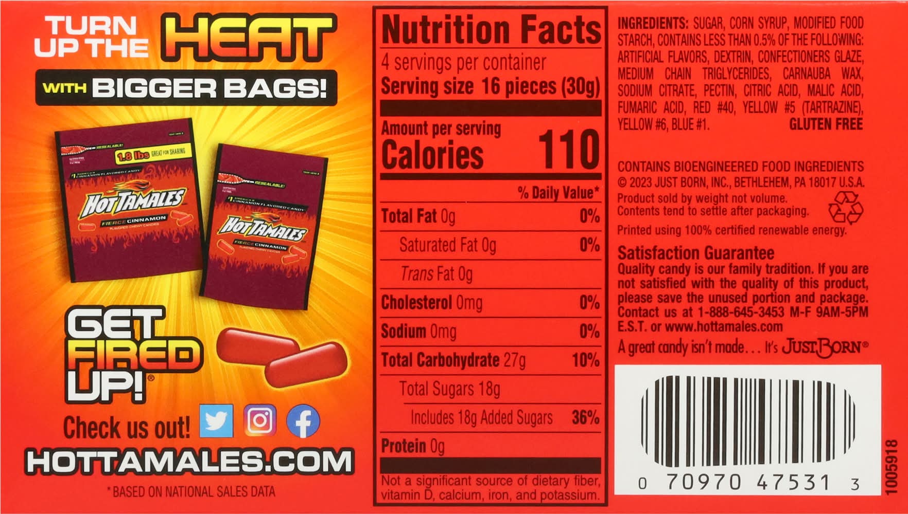 Artificially flavored 110 calories per serving. Gluten free. Fat free. Contains bioengineered food ingredients. No.1 America's Cinnamon flavored candy (Based on National Sales Data). 4 servings per package. Great for sharing. Turn up the heat with bigger bags! Get fired up! Product sold by weight not volume. Contents tend to settle after packaging. A great candy isn't made - it's Just Born. Satisfaction Guarantee: Quality candy is our family tradition. If you are not satisfied with the quality of this product, please save the unused portion and package. • Flavor: Cinnamon • Size: 4.25 OZ