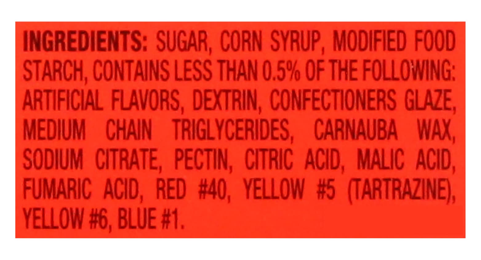 Ingredients: Sugar, Corn Syrup, Modified Food Starch, Contains Less than 0.5% of the Following: Artificial Flavors, Dextrin, Confectioners Glaze, Medium Chain Triglycerides, Carnauba Wax, Sodium Citrate, Pectin, Citric Acid, Malic Acid, Fumaric Acid, Red 40, Yellow 5 (Tartrazine), Yellow 6, Blue 1 Contains: Corn