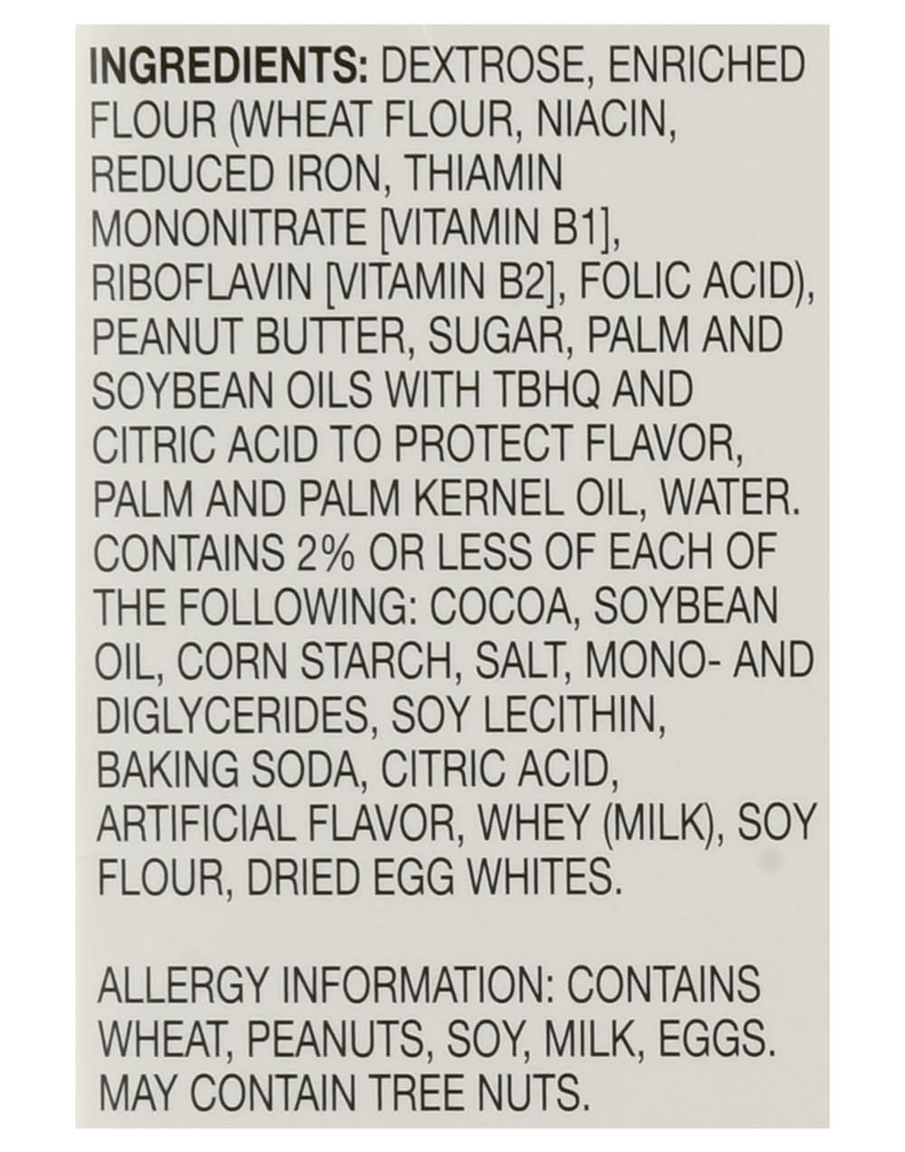 Ingredients: Dextrose, Enriched Flour (Wheat Flour, Niacin, Reduced Iron, Thiamin Mononitrate [Vitamin B1], Riboflavin [Vitamin B2], Folic Acid), Peanut Butter, Sugar, Palm and Soybean Oils with TBHQ and Citric Acid to Protect Flavor, Palm and Palm Kernel Oil, Water, Contains 2% or Less of Each of the Following: Cocoa, Soybean Oil, Corn Starch, Salt, Mono-and Diglycerides, Soy Lecithin, Baking Soda, Citric Acid, Artificial Flavor, Whey (Milk), Soy Flour, Dried Egg Whites Contains: Wheat, Peanuts, Soybeans, Milk, Eggs, Tree Nuts