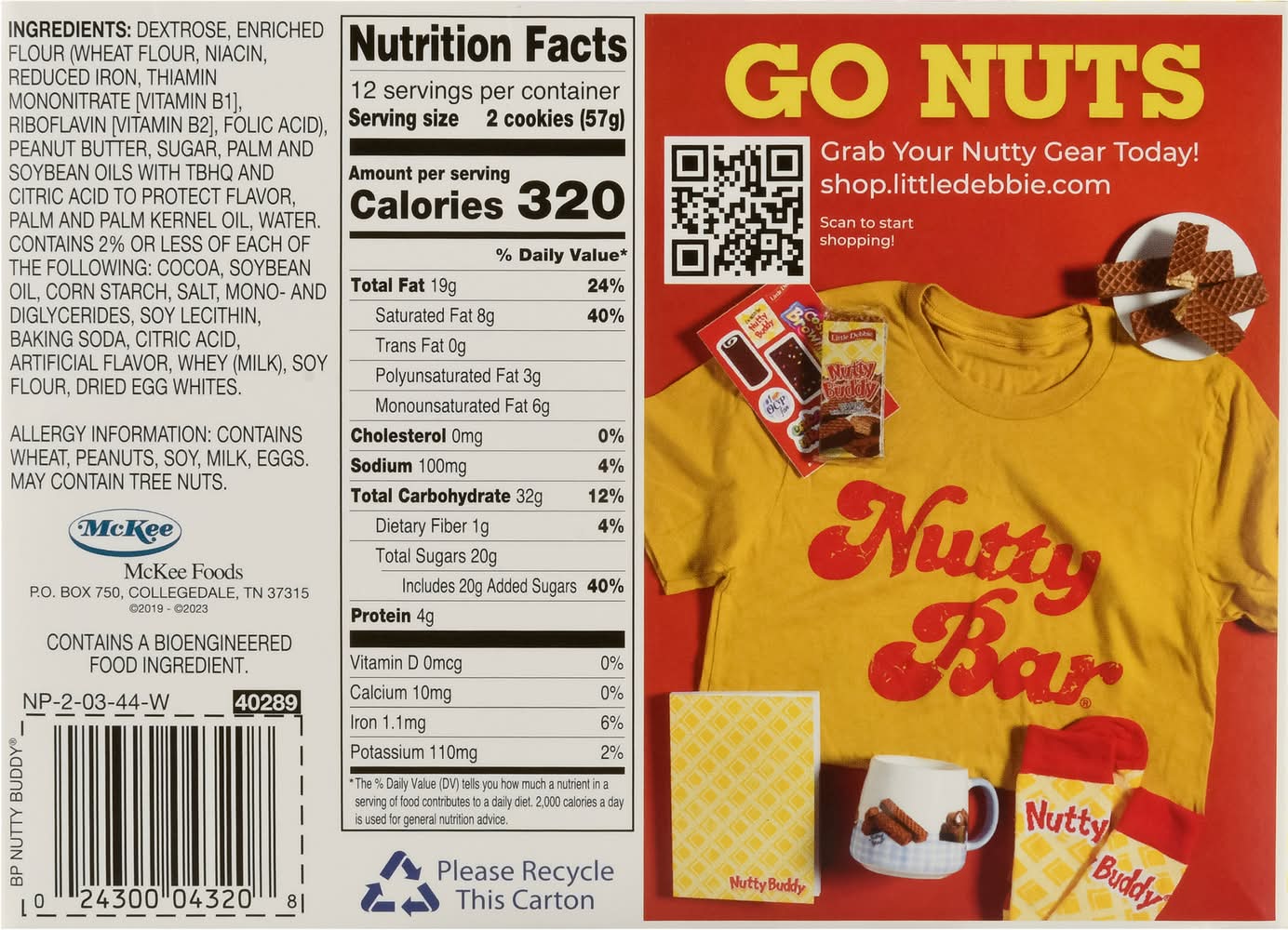 Contains a bioengineered food ingredients. Twin wrapped. Mckee-a family bakery. Peanuts: an american favorite. America's obsession with peanut butter boils down to the key ingredient, the peanut. Peanuts are a versatile snack. Whether salted, sweetened, roasted or boiled-peanuts and peanut butter are a delicious source of protein. • Flavor: Peanut butter • Pack size: 12 • Size: 25.2 OZ • Mckee Foods, Po Box 750, Collegedale, Tn,37315. • Packaging: Reusable