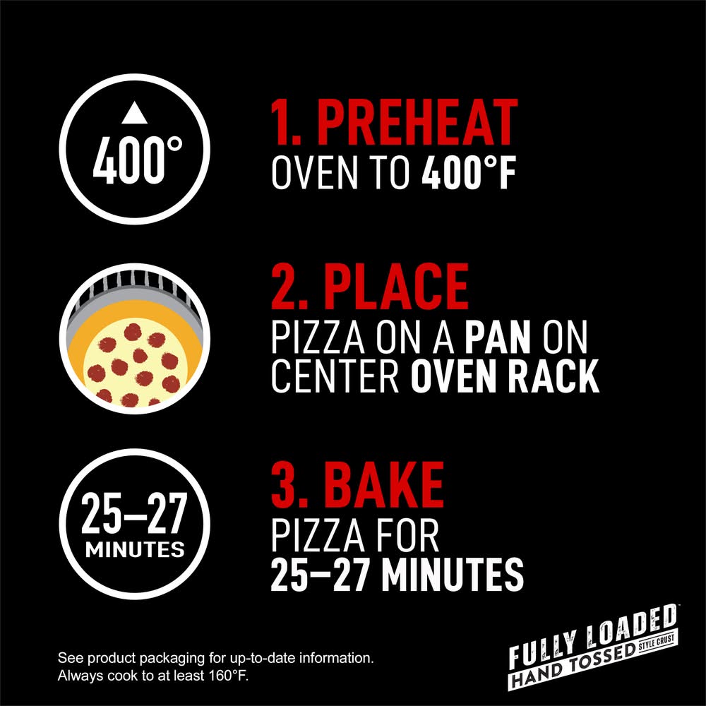 Directions for use: Directions: Pan: Preheat oven to 400 degrees F. Remove pizza from box & overwrap, and place pizza on a pan. Bake on a pan on center rack for 25-27 minutes. For a crispy crust, immediately remove pizza from the pan and allow to cool for at least 2 mins. Don't Forget: Keep pizza frozen while preheating. Remove pizza from box and wrapper before baking. Do not thaw pizza. For food safety and quality cook until the internal temperature is 160 degrees F before eating. Cook thoroughly before eating. Cooking times may vary. Let cool for 2 minutes. Refrigerate or discard any unused portion. Keep frozen, cook as directed. Storage recommendation: Keep frozen, cook as directed.