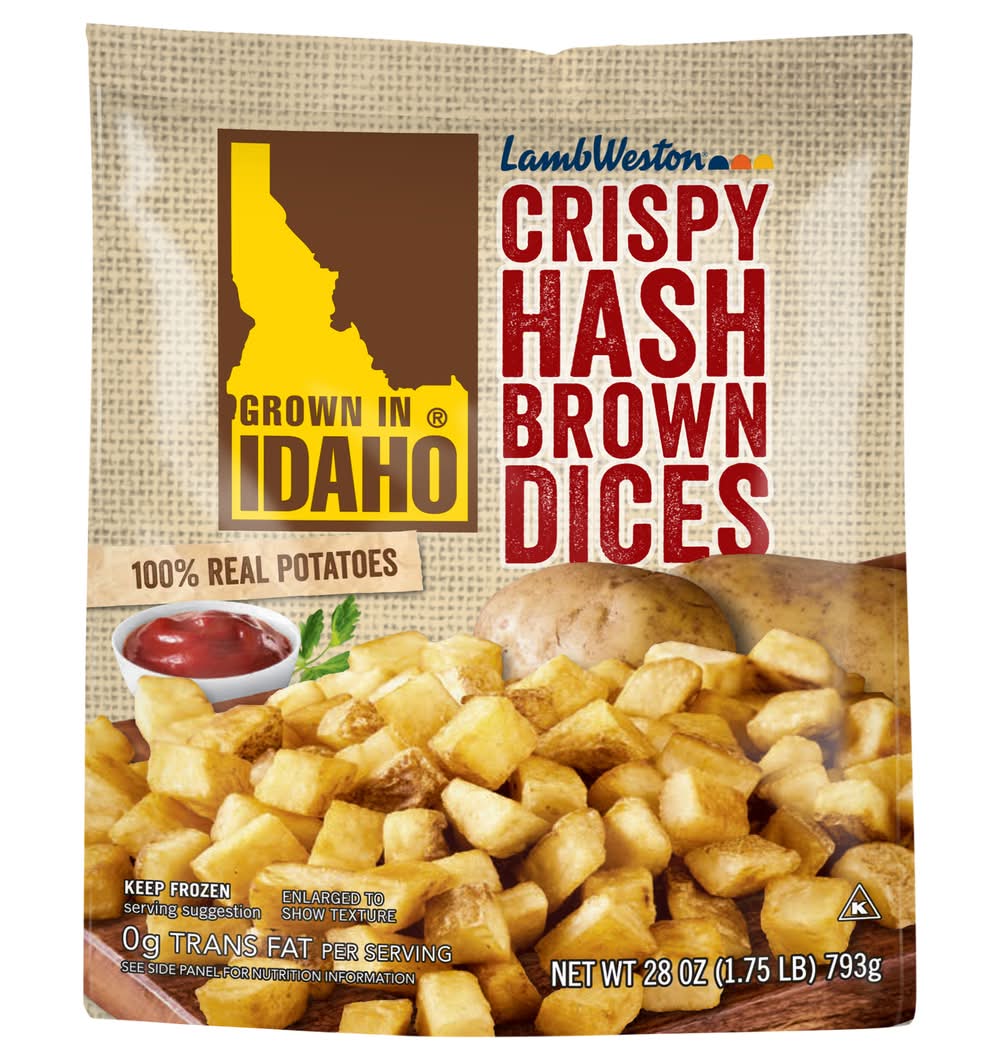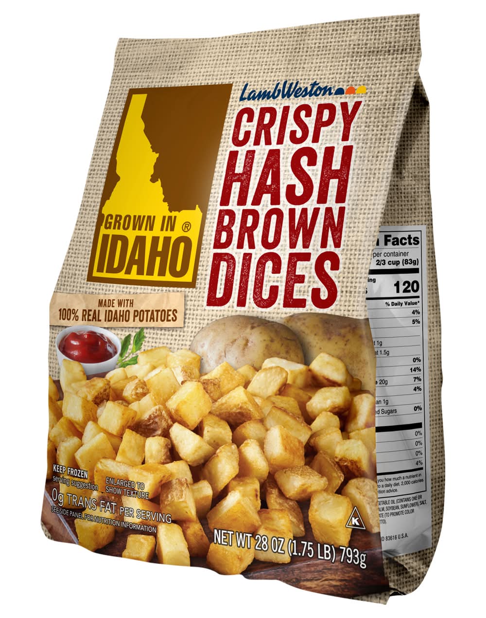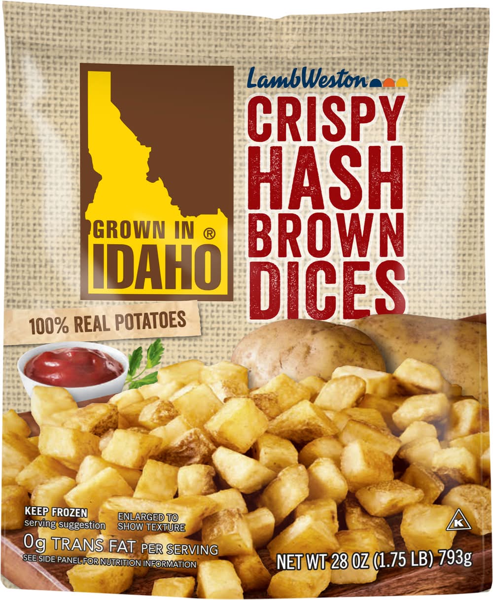 Hash Brown Dices, Crispy • Size: 28 OZ • Number of servings: 10 • Lamb Weston, Eagle, ID, 83616,