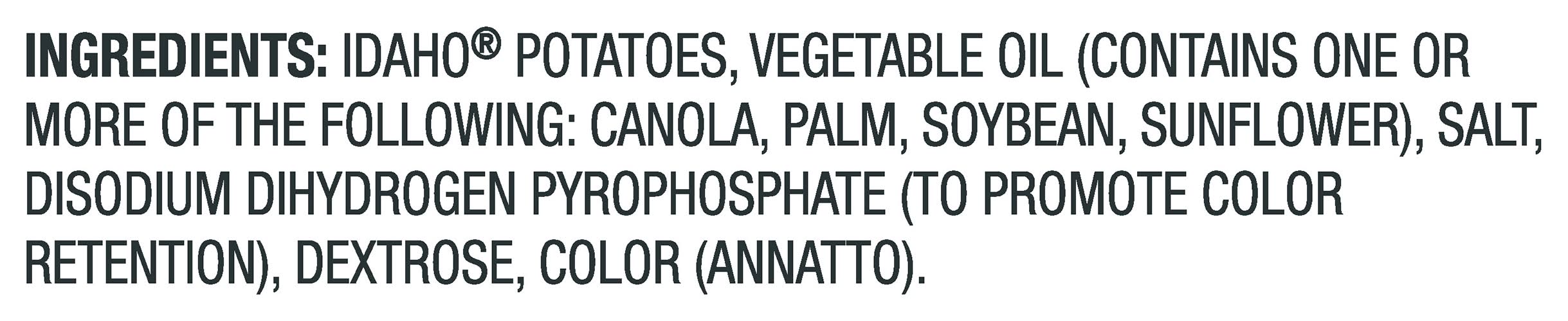 Ingredients: Idaho Potatoes, Vegetable Oil (Contains One or More of the Following: Canola, Palm, Soybean, Sunflower), Salt, Disodium Dihydrogen Pyrophosphate (to Promote Color Retention), Dextrose, Color (Annatto) Contains: Soybeans
