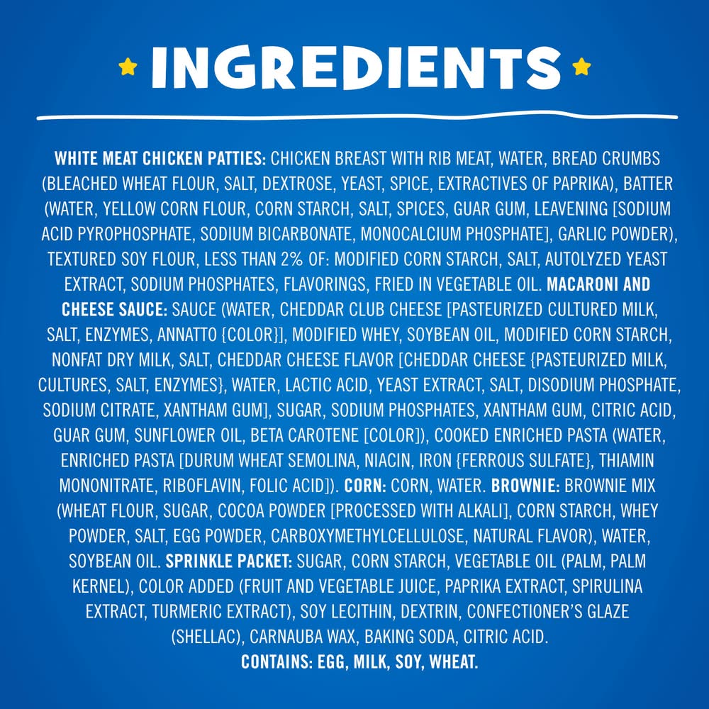 Ingredients: WHITE MEAT CHICKEN PATTIES: Chicken Breast with Rib Meat, Water, Bread Crumbs (Bleached Wheat Flour, Salt, Dextrose, Yeast, Spice, Extractives of Paprika), Batter (Water, Yellow Corn Flour, Corn Starch, Salt, Spices, Guar Gum, Leavening [Sodium Acid Pyrophosphate, Sodium Bicarbonate, Monocalcium Phosphate], Garlic Powder), Textured Soy Flour, Less Than 2% Of: Modified Corn Starch, Salt, Autolyzed Yeast Extract, Sodium Phosphates, Flavorings. Fried In Vegetable Oil. MACARONI AND CHEESE SAUCE: Cheese Sauce, Water, Cheddar Club Cheese [Pasteurized Cultured Milk, Salt, Enzymes, Annatto {Color}], Modified Whey, Soybean Oil, Modified Corn Starch, Nonfat Dry Milk, Cheese Flavor [Whey, Cheese {Granular and Blue (Pasteurized Milk, Cheese Culture, Salt, Enzyme)}, Sunflower Oil, Maltodextrin, Salt, Sodium Phosphate, Citric Acid, Lactic Acid], Salt, Sugar, Sodium Phosphates, Xanthan Gum, Citric Acid, Guar Gum, Sunflower Oil, Beta Carotene [Color], Cooked Enriched Pasta (Water, Enriched Pasta [Durum Wheat Semolina, Niacin, Iron {Ferrous Sulfate}, Thiamin Mononitrate, Riboflavin, Folic Acid]), CORN: Corn, Water. BROWNIE: Brownie Mix (Wheat Flour, Sugar, Cocoa Powder [Processed With Alkali], Corn Starch, Whey Powder, Salt, Egg Powder, Carboxymethylcellulose, Natural Flavor), Water, Soybean Oil. CONTAINS: EGG, MILK, SOY, WHEAT Contains: Egg, Milk, Soy, Wheat