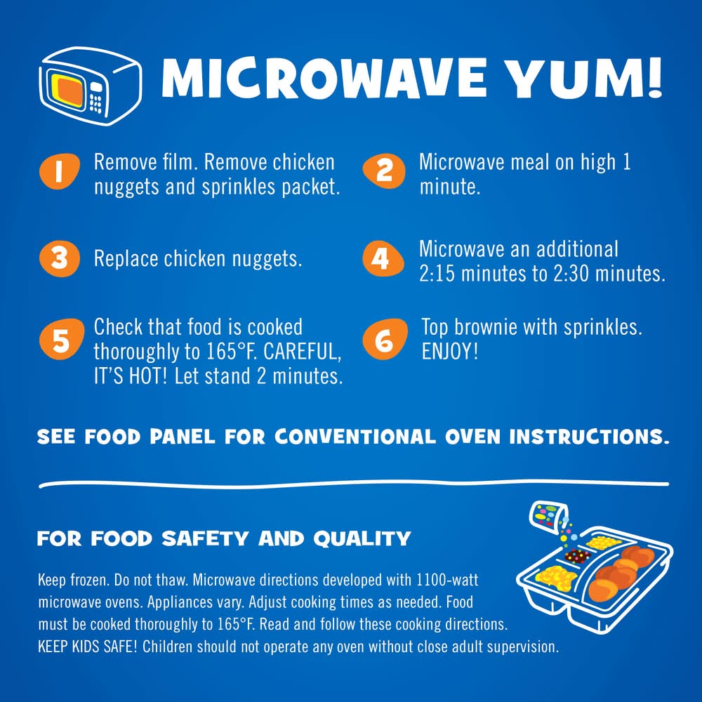 Directions for use: Microwaveable, Must be cooked thoroughly. For Food Safety and Quality: Keep frozen. Do not thaw. Microwave directions developed with 1100-watt microwave ovens. Appliances vary. Adjust cooking times as needed. Food must be cooked thoroughly to 165 degrees F. Read and follow cooking directions. Keep kids safe! Children should not operate any oven without close adult supervision. Microwave Directions: 1. Remove film. Remove chicken nuggets and sprinkles packet. 2. Microwave meal on high 1 minute. 3. Replace chicken nuggets. 4. Microwave on additional 2 minutes 15 seconds to 2 minutes 30 seconds. 5. Check that food is cooked thoroughly to 165 degrees F, careful, it’s hot! Let stand 2 minutes. See top panel for conventional oven instructions. 6. Top brownie with sprinkles. Enjoy. Conventional Oven: Do not prepare in toaster oven. Preheat oven to 350 degrees F. Remove film over chicken nuggets. Remove sprinkles packet. Cook meal on baking sheet in center of oven 28 to 30 minutes. Check that food is cooked thoroughly to 165 degrees F. Careful, it’s hot! Let stand 2 minutes. Top brownie with sprinkles. Enjoy. Keep kids safe! Children should not operate any oven without close adult supervision. Keep frozen.Contains: egg, milk, soy, wheat Storage recommendation: Keep frozen.