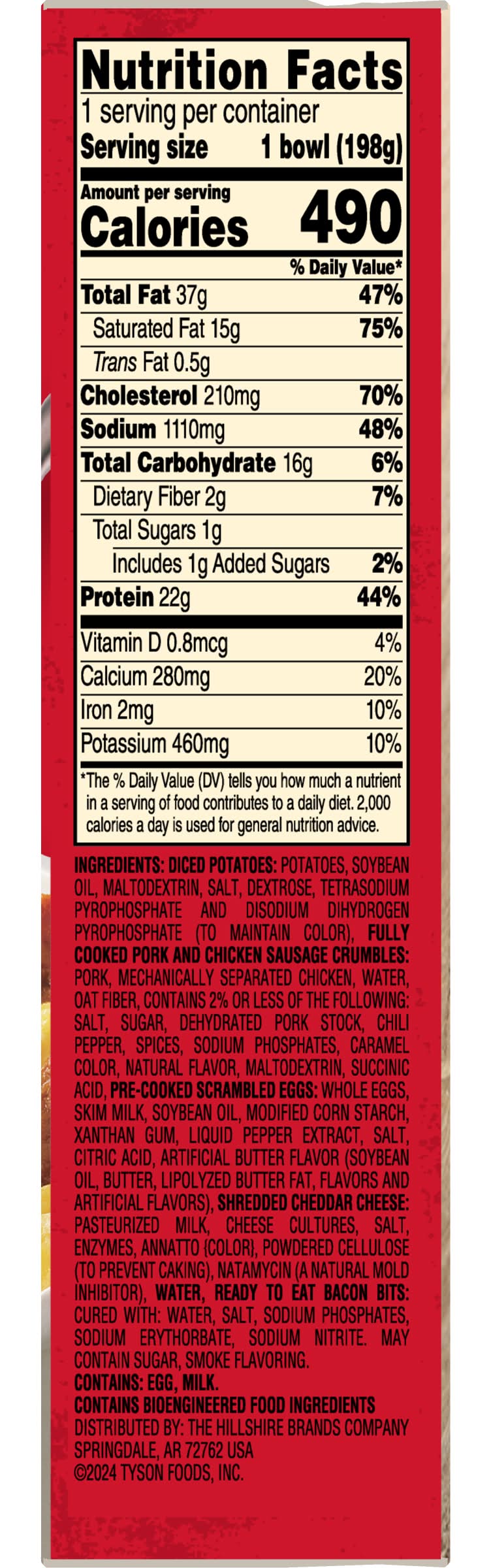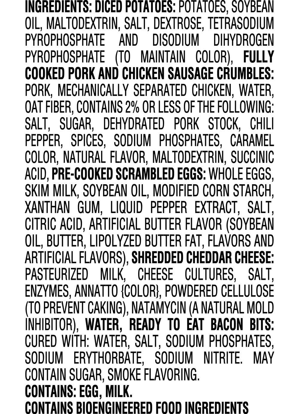 Ingredients: Diced Potatoes: Potatoes, Soybean Oil, Maltodextrin, Salt, Dextrose, Tetrasodium Pyrophosphate And Disodium Dihydrogen Pyrophosphate (To Maintain Color), Fully Cooked Pork And Chicken Sausage Crumbles: Pork, Mechanically Separated Chicken, Water, Oat Fiber, Contains 2% Or Less Of The Following: Salt, Sugar, Dehydrated Pork Stock, Chili Pepper, Spices, Sodium Phosphates, Caramel Color, Natural Flavor, Maltodextrin, Succinic Acid, Pre-Cooked Scrambled Eggs: Whole Eggs, Skim Milk, Soybean Oil, Modified Corn Starch, Xanthan Gum, Liquid Pepper Extract, Salt, Citric Acid, Artificial Butter Flavor (Soybean Oil, Butter (Cream, Salt), Lipolyzed Butter Fat, Flavors And Artificial Flavors), Shredded Cheddar Cheese: Pasteurized Milk, Cheese Cultures, Salt, Enzymes, Annatto {Color}, Powdered Cellulose (To Prevent Caking), Natamycin (A Natural Mold Inhibitor), Water, Ready To Eat Bacon Bits: Cured With: Water, Salt, Sodium Phosphates, Sodium Erythorbate, Sodium Nitrite. May Contain Sugar, Smoke Flavoring. Contains: Eggs, Milk