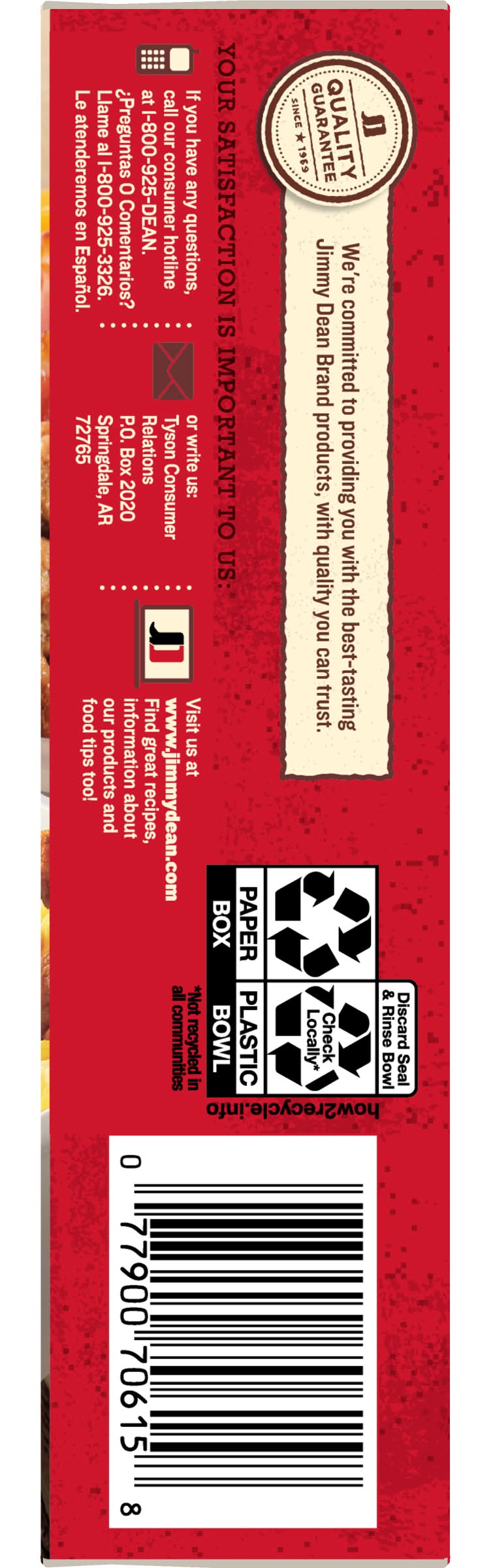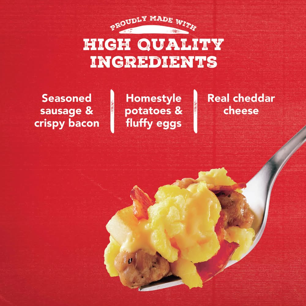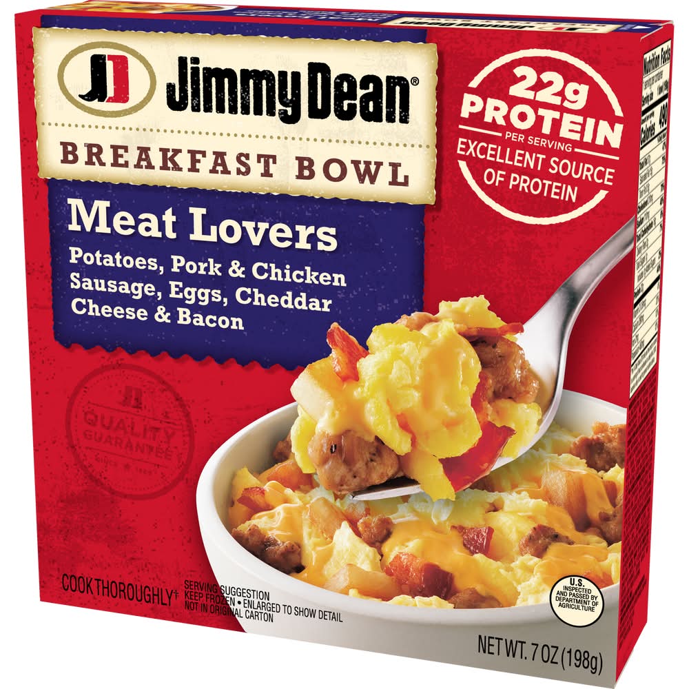 Jimmy Dean Meat Lovers Breakfast Bowl has all of your breakfast favorites together. It's filled with sausage, bacon, eggs, potatoes, and cheddar cheese. This quick breakfast is simple and ready in minutes. Be sure to fully cook this frozen breakfast. Today, Jimmy Dean Brand brings you many ways to add some sunshine to your morning. Because today's your day to shine on. • Size: 7 OZ • The Hillshire Brands Company, Chicago, IL, 60607, USA • Packaging: Reusable
