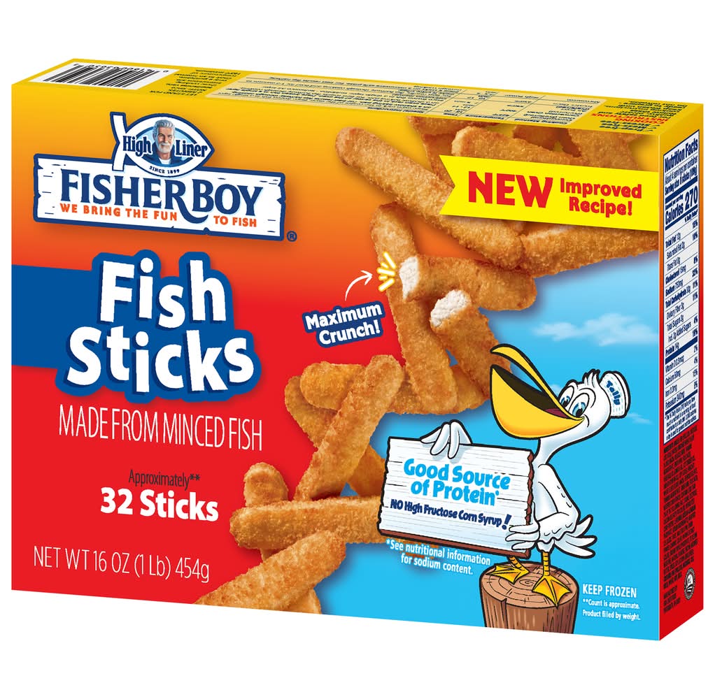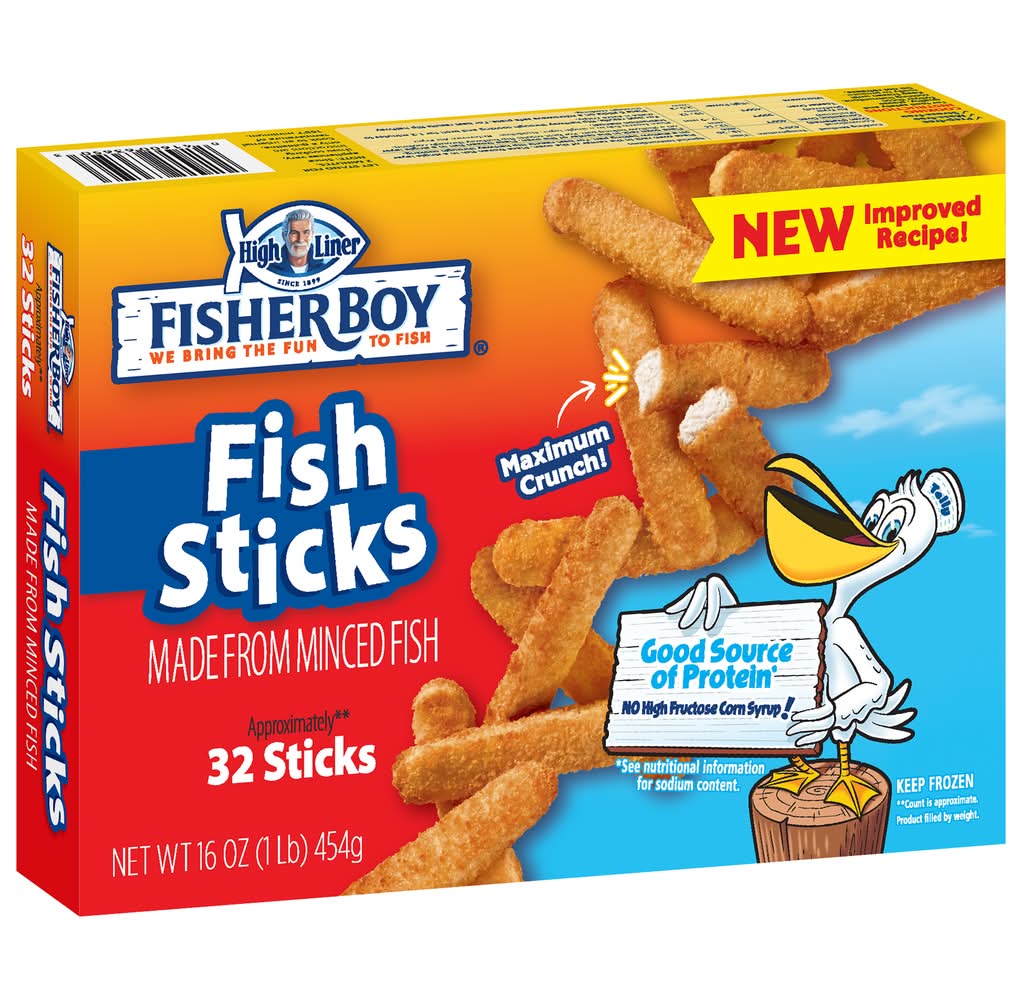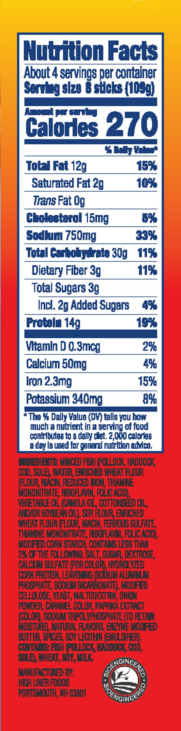 Fish Sticks • Size: 16 OZ • Number of servings: 4 • High Liner Foods, Portsmouth, NH, 03801, Ph: 888-860-3664 • Packaging: Reusable