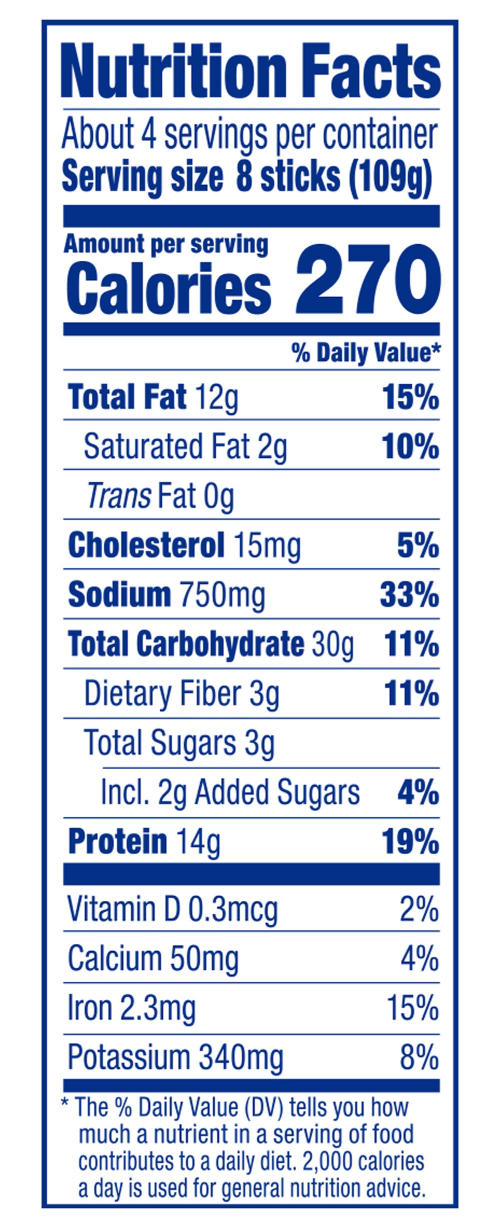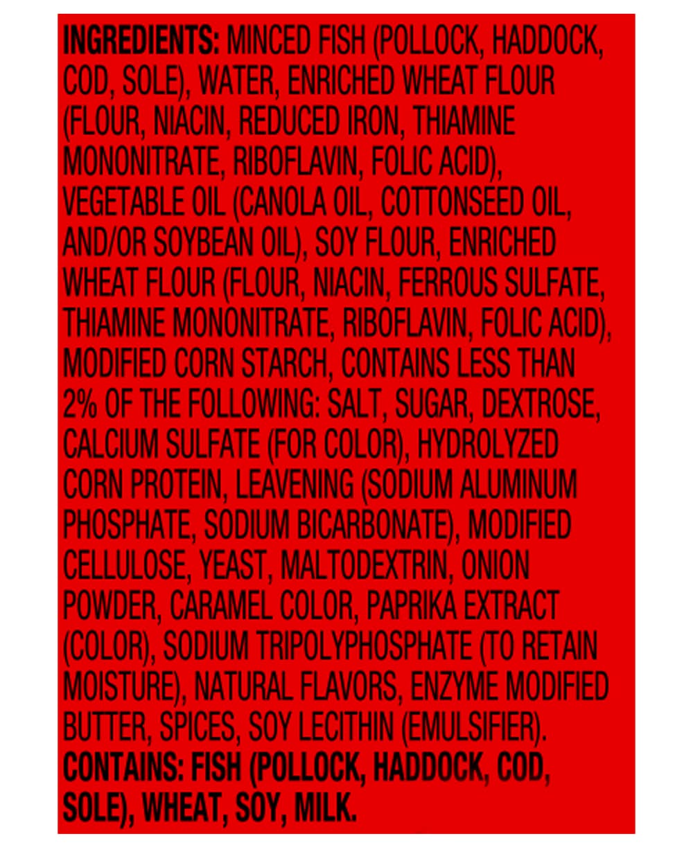Ingredients: Minced Fish (Pollock, Haddock, Cod, Sole), Water, Enriched Wheat Flour (Flour, Niacin, Reduced Iron, Thiamine Mononitrate, Riboflavin, Folic Acid), Vegetable Oil (Canola Oil, Cottonseed Oil, and/or Soybean Oil), Soy Flour, Enriched Wheat Flour (Flour, Niacin, Ferrous Sulfate, Thiamine Mononitrate, Riboflavin, Folic Acid), Modified Corn Starch, Contains Less than 2% of the Following: Salt, Sugar, Dextrose, Calcium Sulfate (for Color), Hydrolyzed Corn Protein, Leavening (Sodium Aluminum Phosphate, Sodium Bicarbonate), Modified Cellulose, Yeast, Maltodextrin, Onion Powder, Caramel Color, Paprika Extract (Color), Sodium Tripolyphosphate (to Retain Moisture), Natural Flavors, Enzyme Modified Butter, Spices, Soy Lecithin (Emulsifier) Contains: Fish, Fish, Pollock, Fish, Haddock, Fish, Cod, Fish, Sole, Wheat, Soybeans, Milk