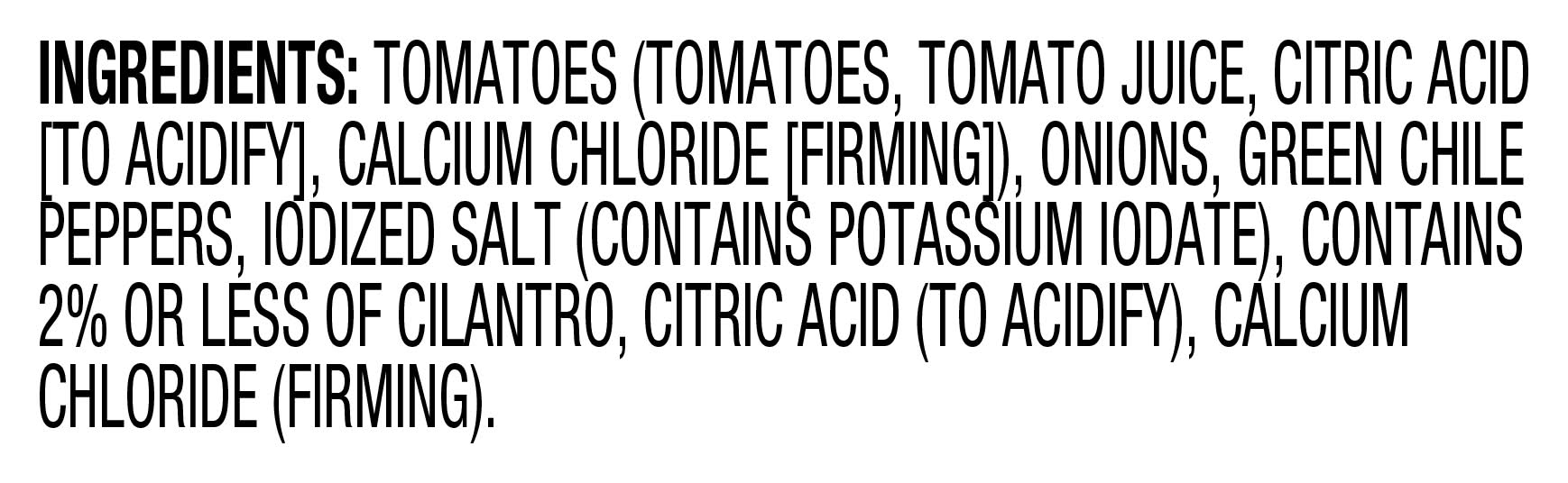 Ingredients: Tomatoes Tomatoes, Tomato Juice, Citric Acid [To Acidify], Calcium Chloride [Firming], Onions, Green Chile Peppers, Contains 2% Or Less Of Iodized Salt (Contains Potassium Iodate), Cilantro, Citric Acid (To Acidify), Calcium Chloride (Firming)