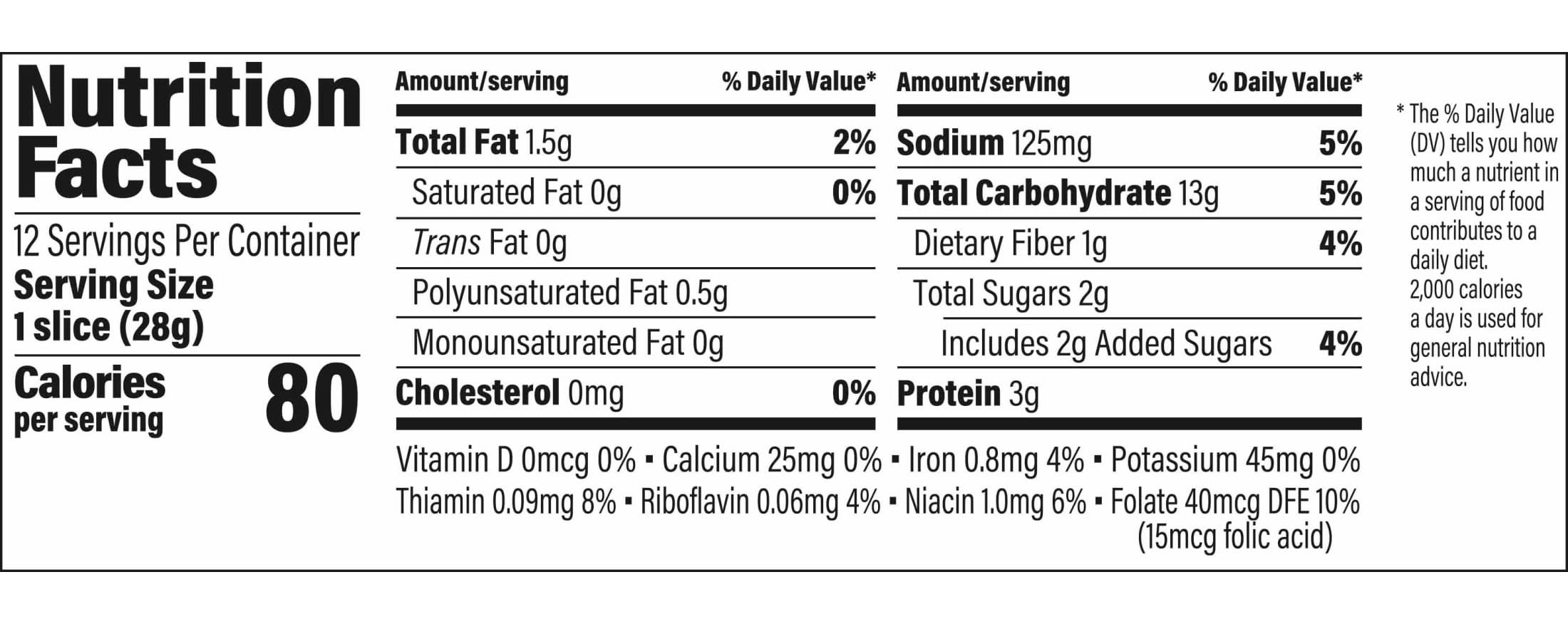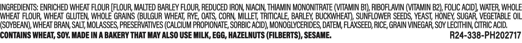 Ingredients: ENRICHED WHEAT FLOUR [FLOUR, MALTED BARLEY FLOUR, REDUCED IRON, NIACIN, THIAMIN MONONITRATE (VITAMIN B1), RIBOFLAVIN (VITAMIN B2), FOLIC ACID], WATER, WHOLE WHEAT FLOUR, WHEAT GLUTEN, WHOLE GRAINS [BULGUR WHEAT, RYE, OATS, CORN, MILLET, TRITICALE, BARLEY, BUCKWHEAT], SUNFLOWER SEEDS, YEAST, HONEY, SUGAR, VEGETABLE OIL (SOYBEAN), WHEAT BRAN, SALT, MOLASSES, PRESERVATIVES [CALCIUM PROPIONATE, SORBIC ACID], MONOGLYCERIDES, DATEM, FLAXSEED, RICE, GRAIN VINEGAR, SOY LECITHIN, CITRIC ACID. Contains: CONTAINS SOY, WHEAT.