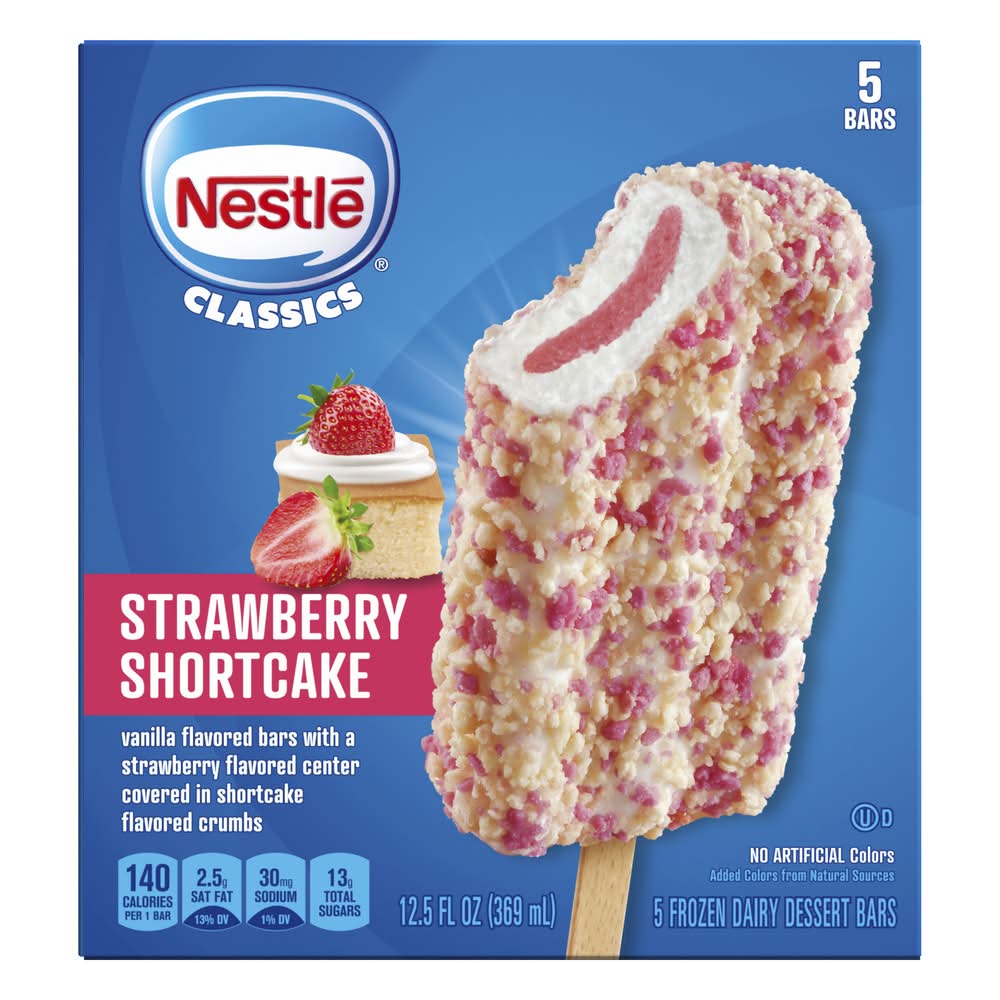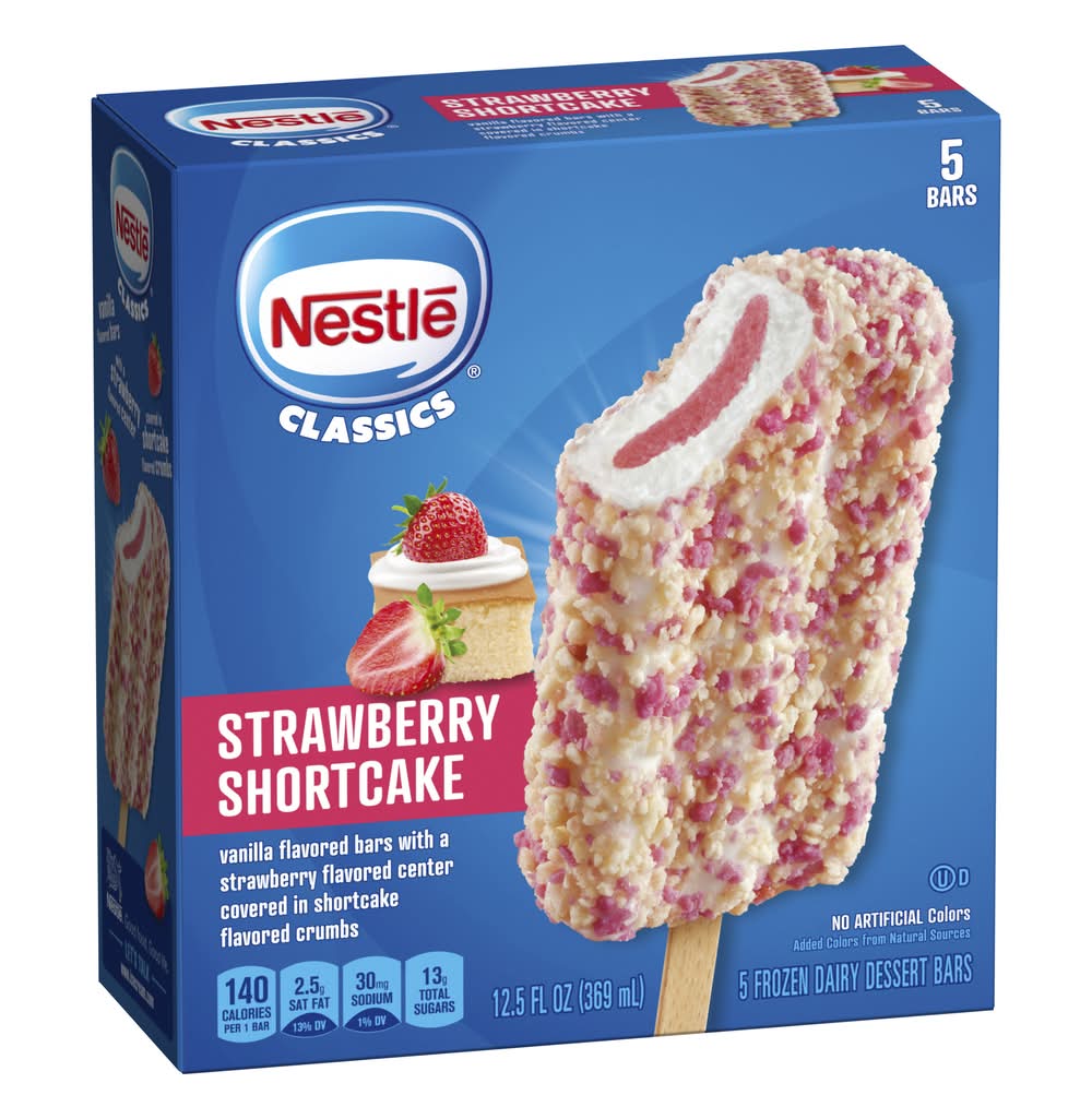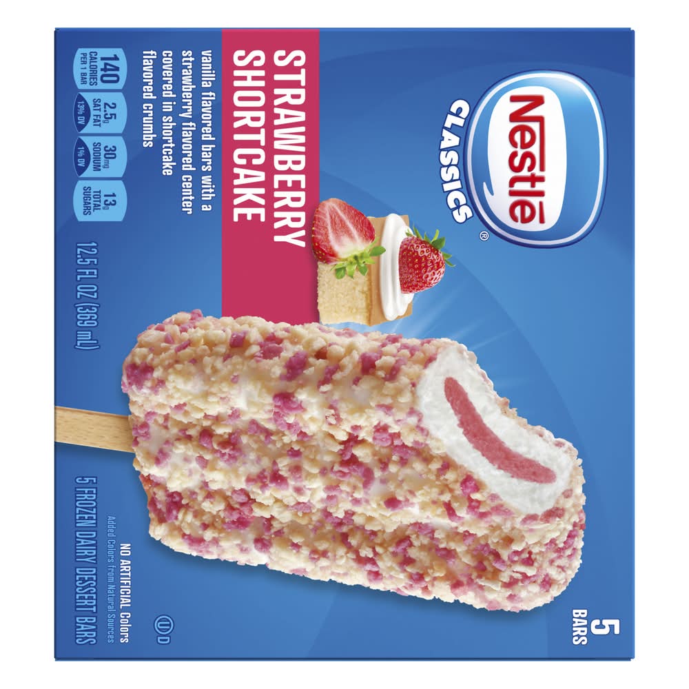 Strawberry Shortcake Bar. Vanilla with strawberry center covered in shortcake crumbs. No artificial flavors or colors. • Flavor: Strawberry • Size: 5 CT