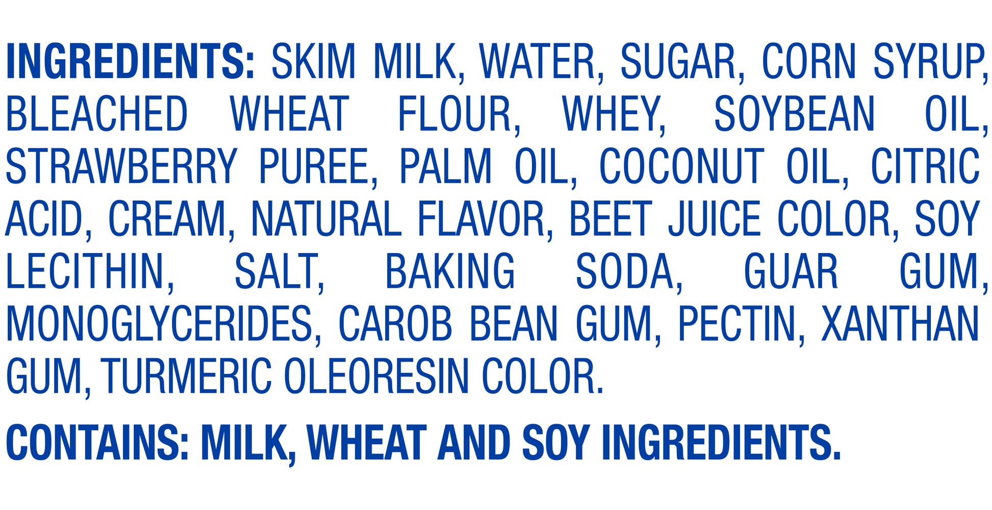 Ingredients: SKIM MILK, WATER, SUGAR, CORN SYRUP, BLEACHED WHEAT FLOUR, WHEY, SOYBEAN OIL, STRAWBERRY PUREE, PALM OIL, COCONUT OIL, CITRIC ACID, CREAM, NATURAL FLAVOR, BEET JUICE COLOR, SOY LECITHIN, SALT, BAKING SODA, GUAR GUM, MONOGLYCERIDES, CAROB BEAN GUM, PECTIN, XANTHAN GUM, TURMERIC OLEORESIN COLOR. Contains: MILK, WHEAT AND SOY INGREDIENTS.