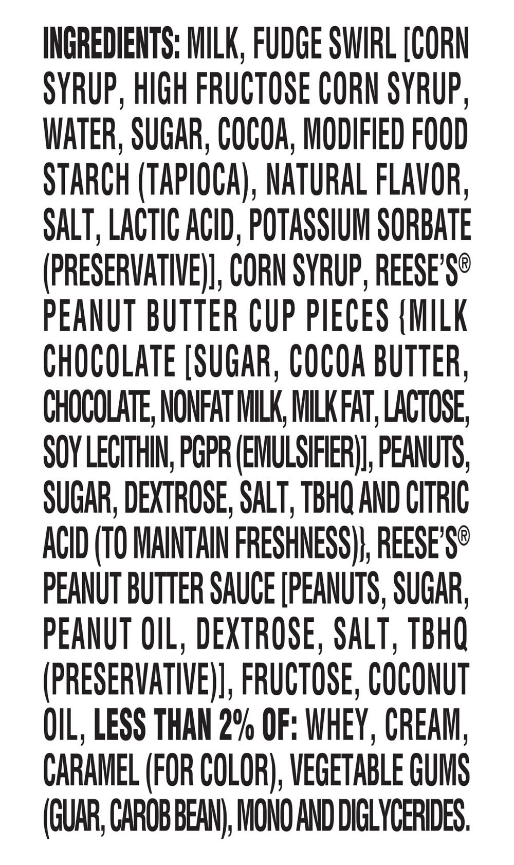 Ingredients: Milk, Fudge Swirl Corn Syrup, High Fructose Corn Syrup, Water, Sugar, Cocoa, Modified Food Starch Tapioca, Natural Flavor, Salt, Lactic Acid, Potassium Sorbate Preservative], Corn Syrup, Reese's Peanut Butter Cup Pieces Milk Chocolate Sugar, Cocoa Butter, Chocolate, Nonfat Milk, Milk Fat, Lactose, Soy Lecithin, PGPR Emulsifier, Peanuts, Sugar, Dextrose, Salt, TBHQ and Citric Acid to Maintain Freshness, Reese's Peanut Butter Sauce Peanuts, Sugar, Peanut Oil, Dextrose, Salt, TBHQ Preservative, Fructose, Coconut 5% Oil, Less than 2% of: Whey, Cream, 1% Caramel for Color, Vegetable Gums Guar, Carob Bean, Mono and Diglycerides.