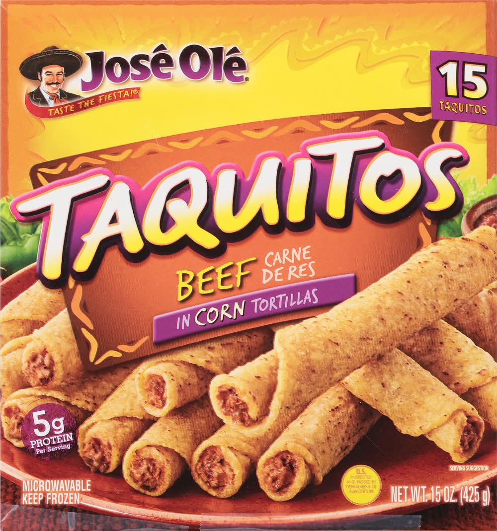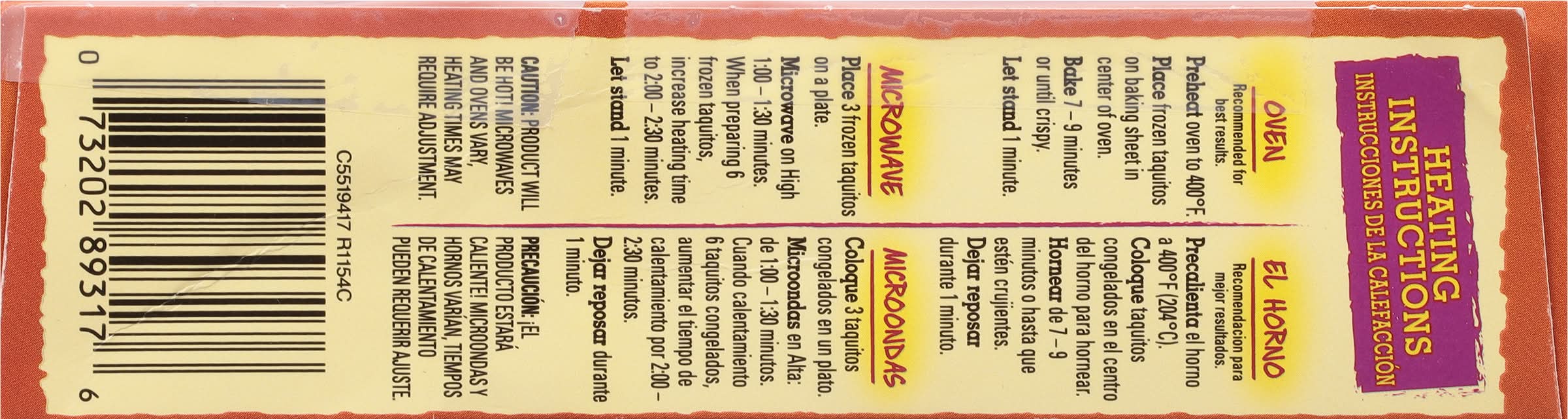 Directions for use: Directions: Heating Instructions: Oven: Recommended for best results. Preheat oven to 400 degrees F. Place frozen taquitos on baking sheet in center of oven. Bake 7-9 minutes or until crispy. Let stand 1 minute. Microwave: Place 3 frozen taquitos on a plate. Microwave on high 1:00 - 1:30 minutes. When preparing 6 frozen taquitos, increase heating time to 2:00 - 2:30 minutes. Let stand 1 minute. Caution: Product will be hot! Microwaves and ovens vary, heating time may require adjustment. Keep frozen. Storage recommendation: Keep frozen.