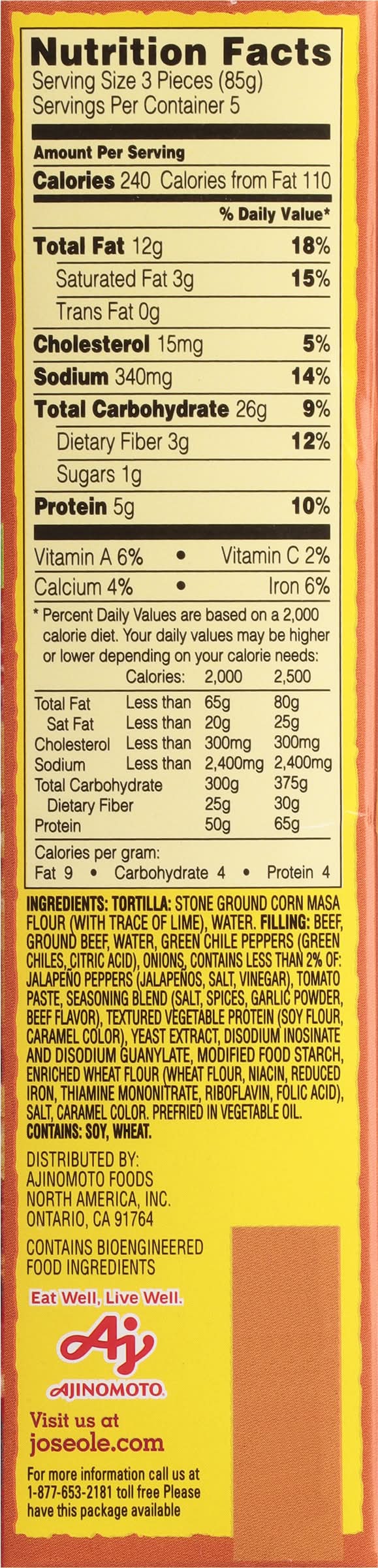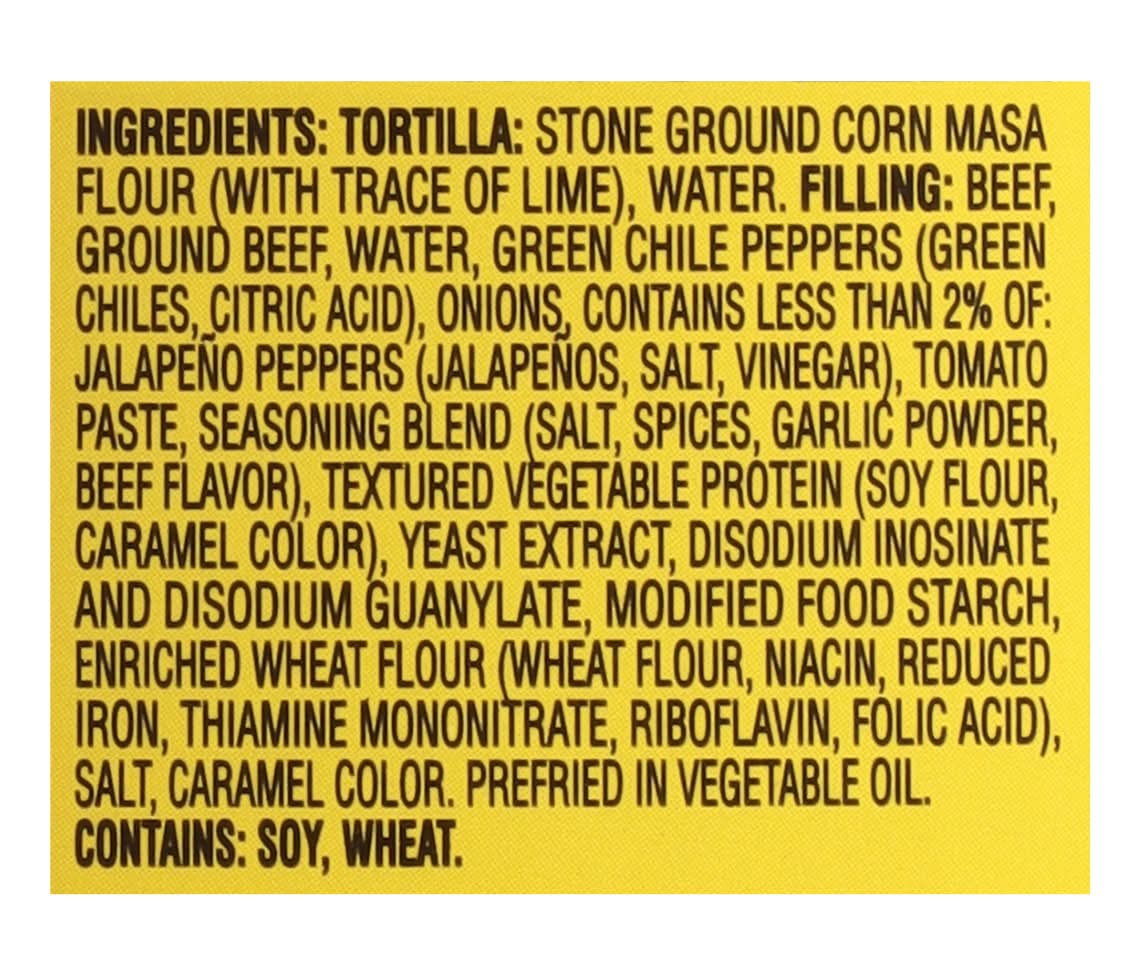 Ingredients: Tortilla: Stone Ground Corn Masa Flour (with Trace of Lime), Water. Filling: Beef, Ground Beef, Water, Green Chile Peppers (Green Chiles, Citric Acid), Onions, Contains Less than 2% of Jalapeno Peppers (Jalapenos, Salt, Vinegar), Tomato Paste, Seasoning Blend (Salt, Spices, Garlic Powder, Beef Flavor), Textured Vegetable Protein (Soy Flour, Caramel Color), Yeast Extract, Disodium Inosinate and Disodium Guanylate, Modified Food Starch, Enriched Wheat Flour (Wheat Flour, Niacin, Reduced Iron, Thiamine Mononitrate, Riboflavin, Folic Acid), Salt, Caramel Color. Prefried in Vegetable Oil Contains: Corn, Soybeans, Wheat