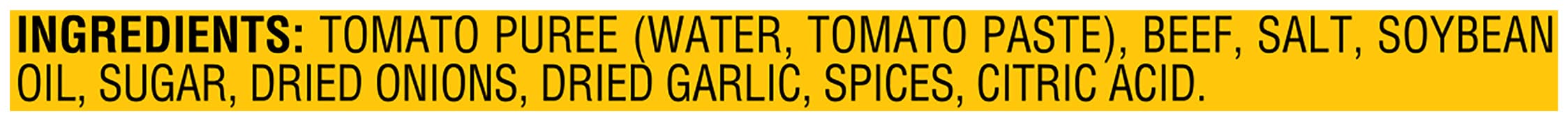 Ingredients: Tomato Puree (Water Tomato Paste), Cooked Ground Beef, Salt, Olive Oil, Sugar, Dehydrated Onions, Dehydrated Garlic, Spices, Citric Acid Contains: Soybeans