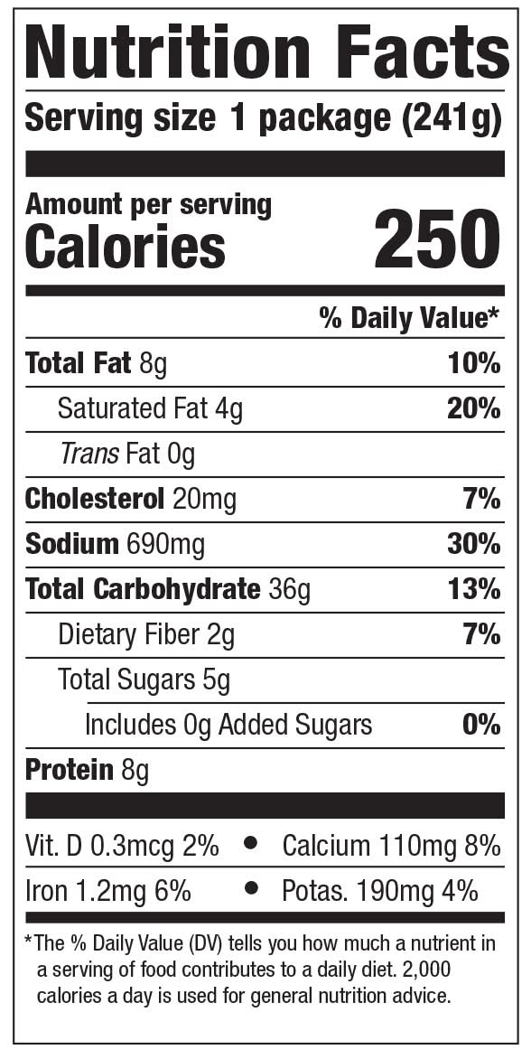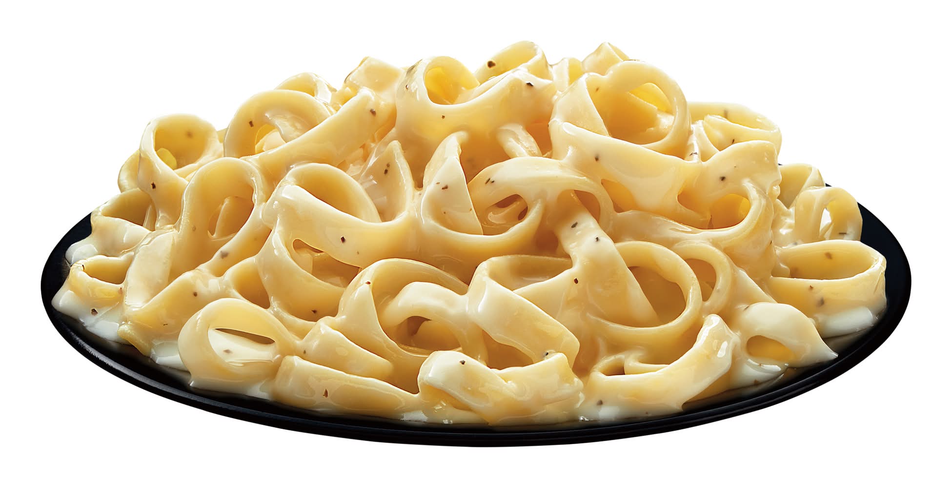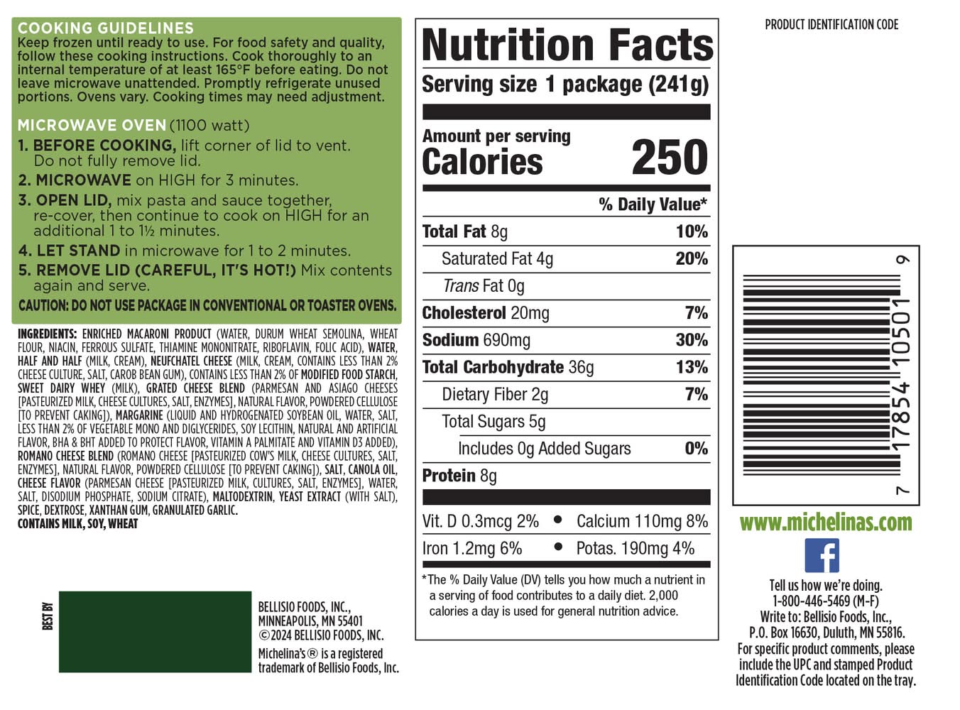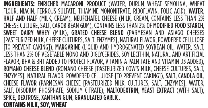 Ingredients: Cooked Enriched Macaroni Product Water, Durum Wheat Semolina, Wheat Flour, Niacin, Ferrous Sulfate, Thiamine Mononitrate, Riboflavin, Folic Acid, Water, Half and Half Milk, Cream, Neufchatel Cheese Pasteurized, Milk and Cream, Cheese Culture, Salt, Carob Bean Gum, Less than 2% of Modified Food Starch, Sweet Dairy Whey, Grated Cheese Blend Parmesan and Asiago Cheese [Pasteurized Milk, Cheese Cultures, Salt, Enzymes], Natural Flavor, Powdered Cellulose [to Prevent Caking], Margarine Liquid and Hydrogenated Soybean Oil, Water, Salt, Less than 2% Vegetable Mono and Diglycerides, Soy Lecithin, Natural and Artificial Flavor, BHA & BHT Added to Protect Flavor, Vitamin A Palmitate and Vitamin D3 Added, Romano Cheese Blend Romano Cheese [Pasteurized Cow's Milk, Cheese Cultures, Salt, Enzymes], Natural Flavor, Powdered Cellulose [to Prevent Caking], Salt, Canola Oil, Cheese Flavor Parmesan Cheese [Pasteurized Milk, Cultures, Salt, Enzymes], Water, Salt, Disodium Phosphate, Sodium Citrate, Maltodextrin, Yeast Extract, Spice, Dextrose, Xanthan Gum, Granulated Garlic. Contains: Milk, Soybeans, Wheat