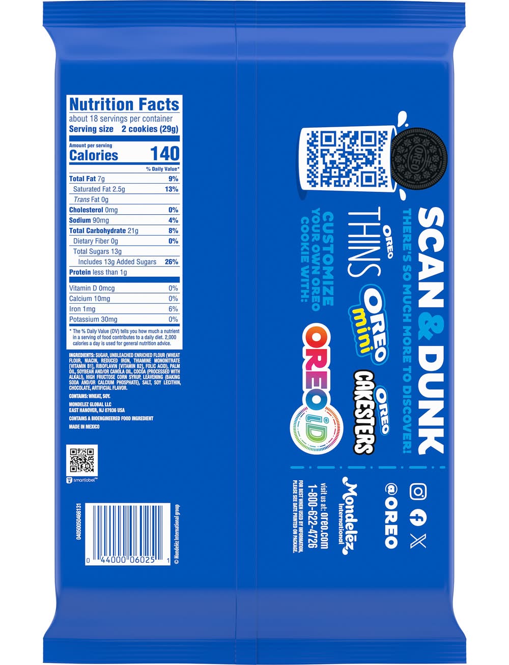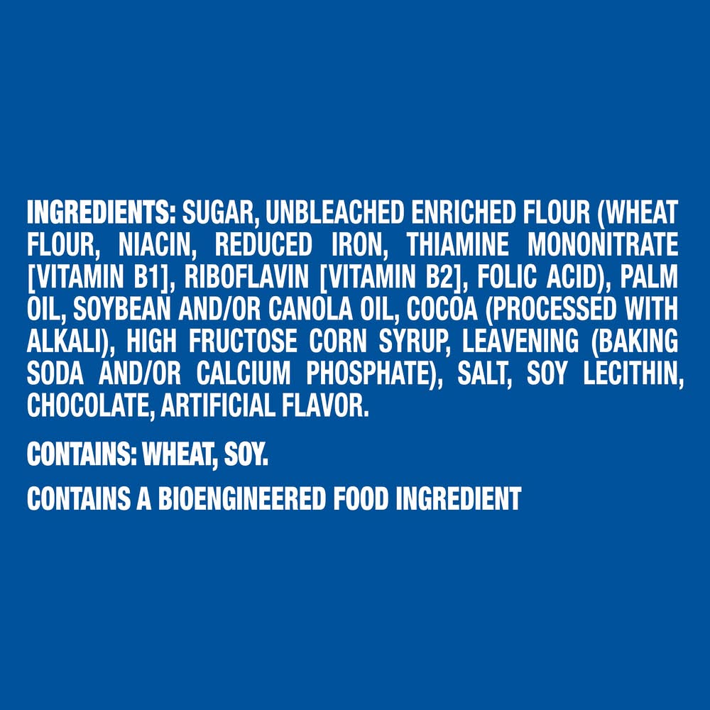 Ingredients: Sugar, Unbleached Enriched Flour (Wheat Flour, Niacin, Reduced Iron, Thiamine Mononitrate {Vitamin B1}, Riboflavin {Vitamin B2}, Folic Acid), Palm Oil, Soybean and/or Canola Oil, Cocoa (Processed with Alkali), High Fructose Corn Syrup, Leavening (Baking Soda and/or Calcium Phosphate), Salt, Soy Lecithin, Chocolate, Artificial Flavor. Contains: Wheat, Soybeans, Corn