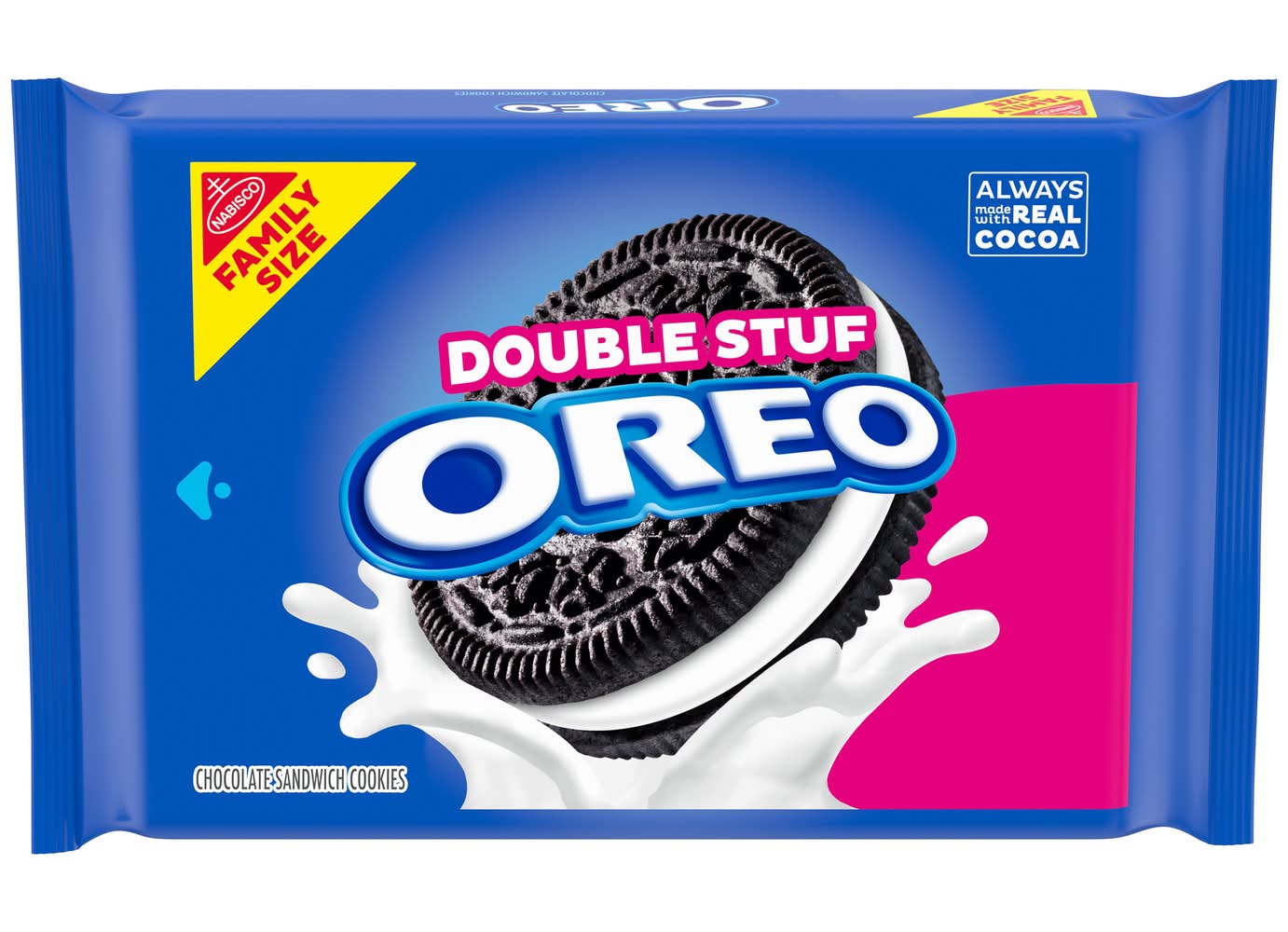 Take a delicious break with Double Stuf Chocolate Sandwich Cookies, Supremely dunkable,Double Stuf cookies are stuffed with twice as much original creme between two Always Made with Real Cocoa chocolate wafers--making them milk's favorite cookie. chocolate sandwich cookies are great for serving as a dessert, with ice cream, as party snacks at your next gathering, or for packing sweet snacks with lunch at school or work. You can even mix these bulk snack cookies into your favorite dessert recipe or cheesecake recipe for something a little extra special. The resealable package of cookies with easy-pull tab keeps bulk chocolate cookies fresh and is great for snacking, sharing or traveling. Whether you TWIST, LICK, or DUNK, cookies are a great sweet treat for any snacking occasion (even cookies for Santa!) • Flavor: Chocolate • Size: Family Size • Packaging: Reusable