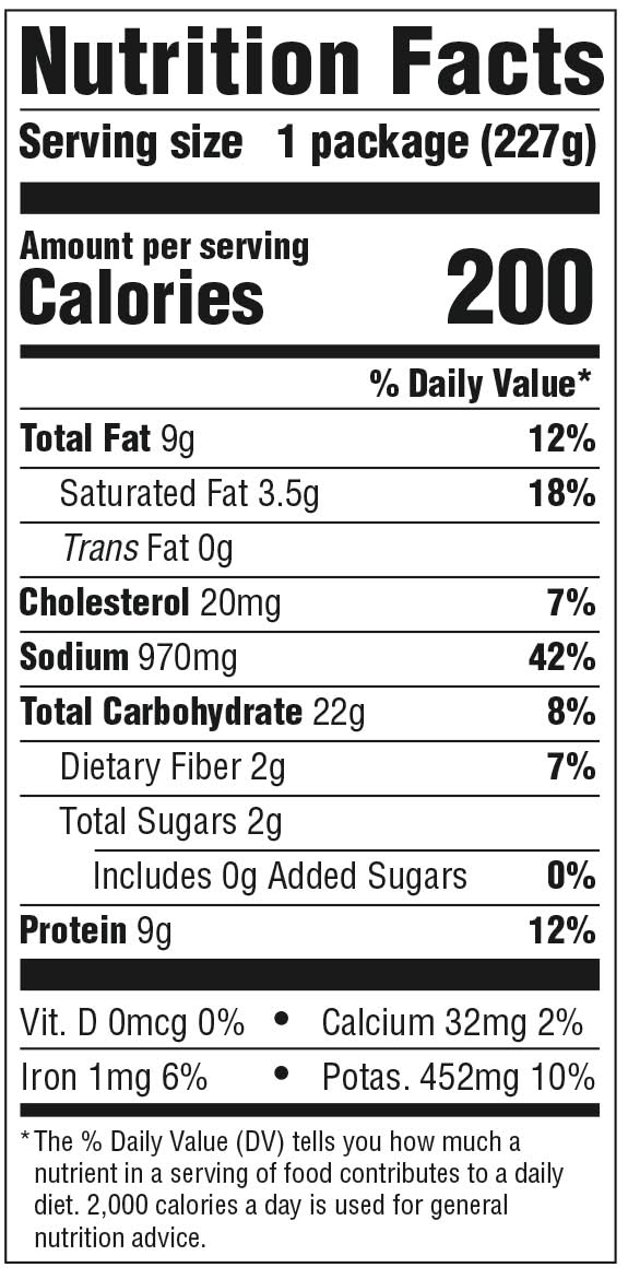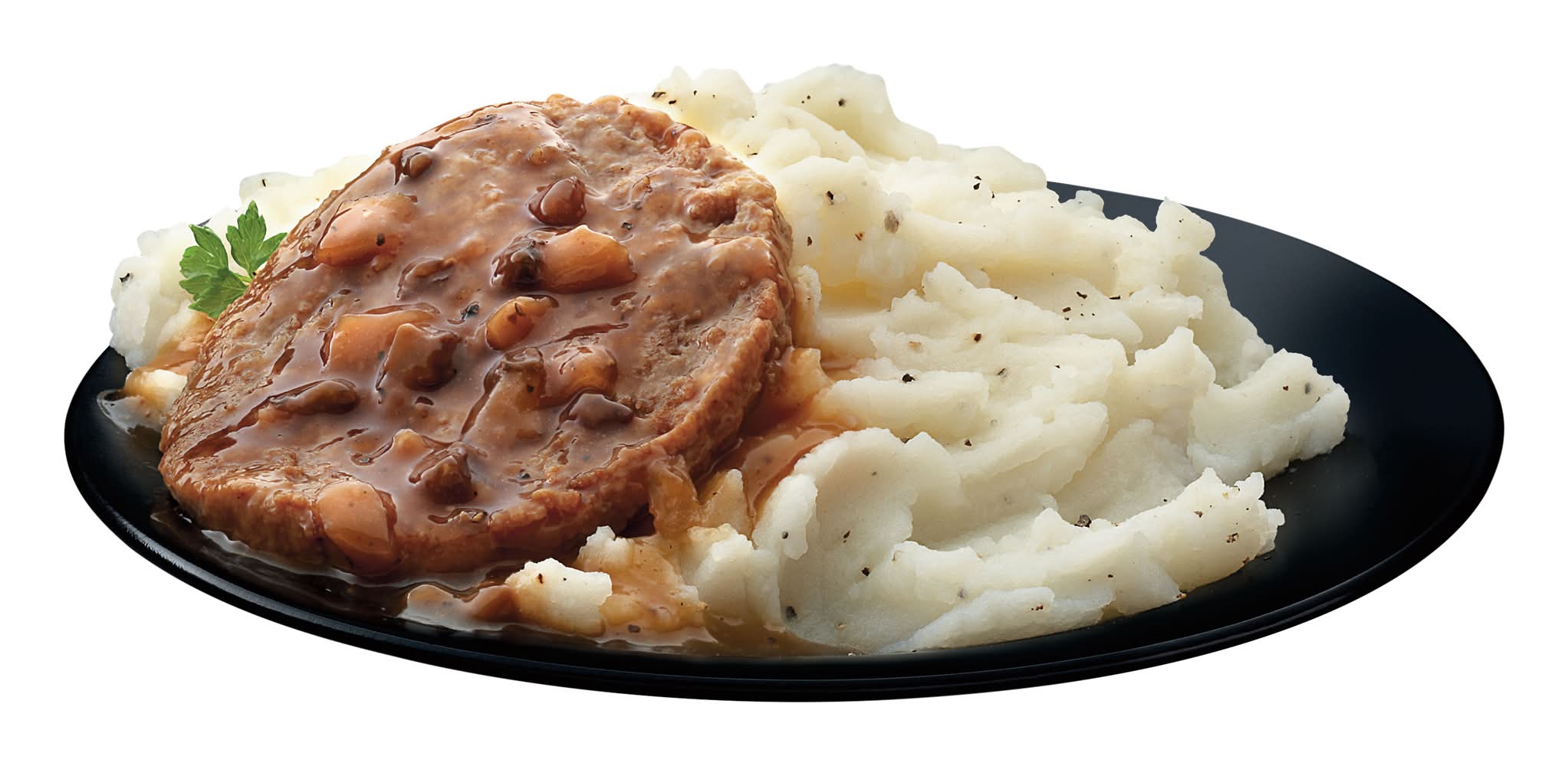Ingredients: Water, Cooked Salisbury Steak Beef, Water, Pork, Textured Vegetable Protein [Soy Flour, Caramel Color], Bread Crumbs [Enriched Wheat Flour {Wheat Flour, Niacin, Reduced Iron, Thiamine Mononitrate, Riboflavin, Folic Acid}, Dried Yeast], Dehydrated Minced Onions, Defatted Soy Flour, Seasoning [Salt, Tomato Powder, Beef Extract, Spices, Maltodextrin, Natural Flavors], Celery, Granulated Onion, Potato Flakes and Granules Potatoes, Mono and Diglycerides, Sodium Acid Pyrophosphate, Citric Acid, Freshness Preserved with Sodium Bisulfite, BHA and BHT, Onions, Mushrooms, Contains Less than 2% of Modified Food Starch, Milk Solids Cream, Milkfat, Nonfat Milk, Beef Base Roasted Beef and Concentrated Beef Stock, Hydrolyzed Soy Protein [Hydrolyzed Soy Protein {Hydrolyzed Corn Gluten, Soy Protein, Wheat Gluten}], Corn Oil, Sugar, Autolyzed Yeast Extract, Flavorings, Maltodextrin, Whey, Dextrose, Half and Half Milk, Cream, Canola Oil, Fruit Juice Color, Beef Flavor Hydrolyzed Soy Protein, Beef Flavor [Beef Stock and Beef, Yeast Extract, Maltodextrin], Beef Extract, Chicken Fat, Yeast Extract, Onion Powder, Garlic Powder, Spice Extractives, Granulated Garlic, Yeast Extract, Spices, Celery Seeds. Contains: Milk, Soy, Wheat