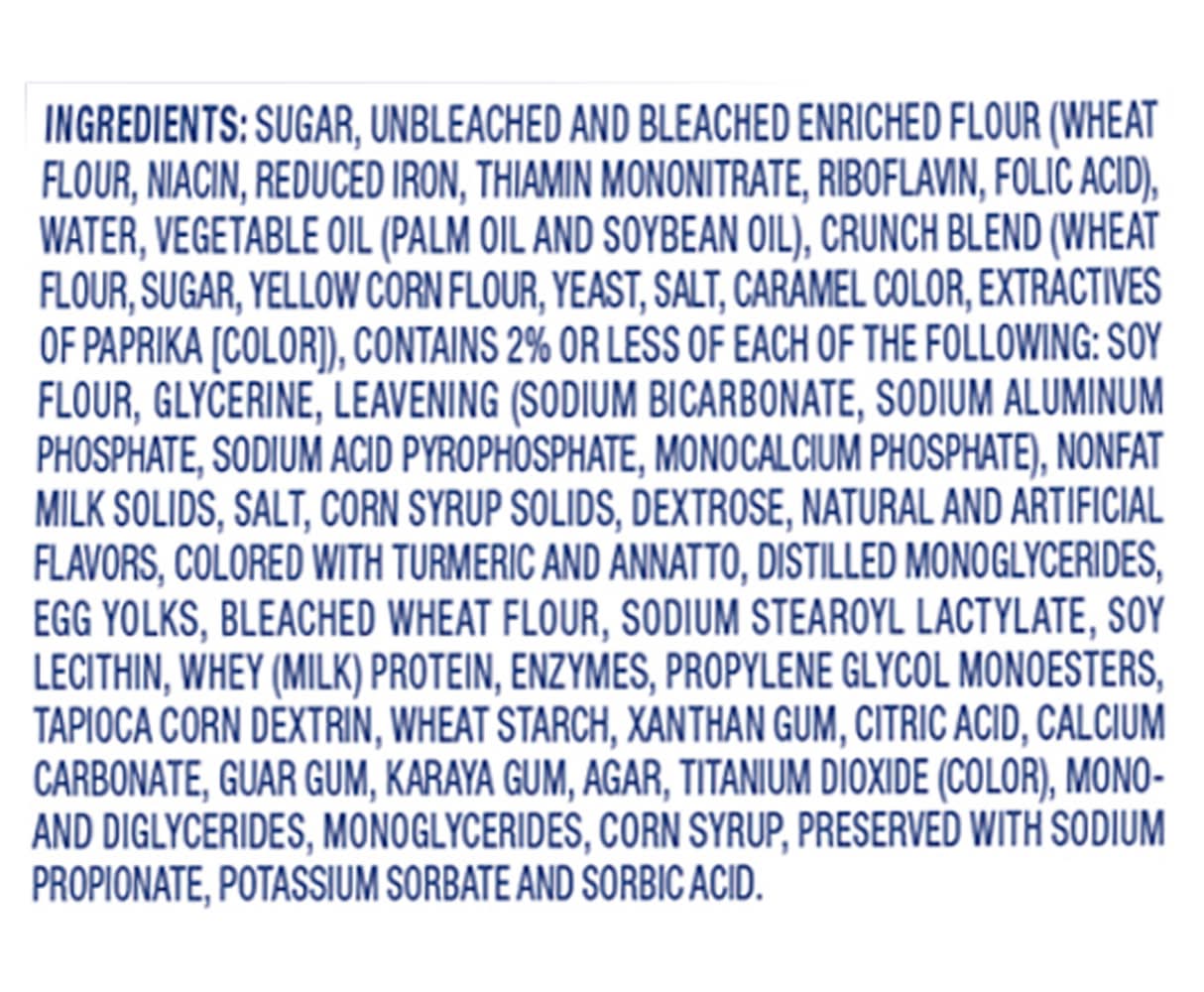 Ingredients: Sugar, Unbleached and Bleached Enriched Flour (Wheat Flour, Niacin, Reduced Iron, Thiamin Mononitrate, Riboflavin, Folic Acid), Water, Vegetable Oil (Palm Oil and Soybean Oil), Crunch Blend (Wheat Flour, Sugar, Yellow Corn Flour, Yeast, Salt, Caramel Color, Extractives of Paprika [Color]), Contains 2% or Less of Each of the Following: Soy Flour, Glycerine, Leavening (Sodium Bicarbonate, Sodium Aluminum Phosphate, Sodium Acid Pyrophosphate, Monocalcium Phosphate), Nonfat Milk Solids, Salt, Corn Syrup Solids, Dextrose, Natural and Artificial Flavors, Colored with Turmeric and Annatto, Distilled Monoglycerides, Egg Yolks, Bleached Wheat Flour, Sodium Stearoyl Lactylate, Soy Lecithin, Whey (Milk) Protein, Enzymes, Propylene Glycol Monoesters, Tapioca Corn Dextrin, Wheat Starch, Xanthan Gum, Citric Acid, Calcium Carbonate, Guar Gum, Karaya Gum, Agar, Titanium Dioxide (Color), Monoand Diglycerides, Monoglycerides, Corn Syrup, Preserved with Sodium Propionate, Potassium Sorbate and Sorbic Acid Contains: Wheat, Soybeans, Corn, Eggs, Milk