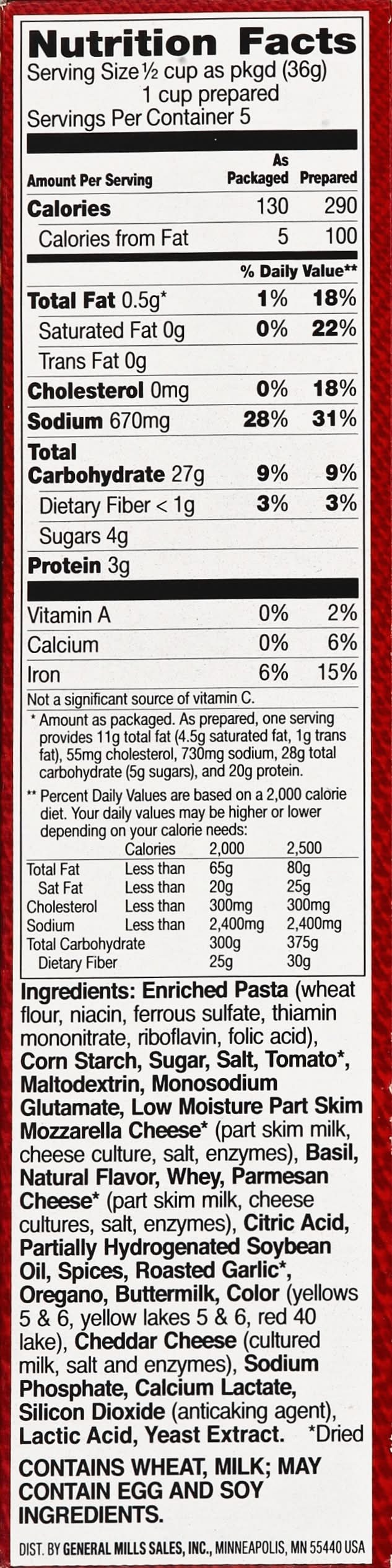 Ingredients: Enriched Pasta (Wheat Flour, Niacin, Ferrous Sulfate, Thiamin Mononitrate, Riboflavin, Folic Acid), Corn Starch, Sugar, Salt, Tomato (Dried), Maltodextrin, Monosodium Glutamate, Low Moisture Part Skim Mozzarella Cheese (Dried) (Part Skim Milk, Cheese Culture, Salt, Enzymes), Basil, Natural Flavor, Whey, Parmesan Cheese (Dried) (Part Skim Milk, Cheese Cultures, Salt, Enzymes), Citric Acid, Partially Hydrogenated Soybean Oil, Spices, Roasted Garlic (Dried), Oregano, Buttermilk, Color (Yellows 5 & 6, Yellow Lakes 5 & 6, Red 40 Lake), Cheddar Cheese (Cultured Milk, Salt and Enzymes), Sodium Phosphate, Calcium Lactate, Silicon Dioxide (Anticaking Agent), Lactic Acid, Yeast Extract Contains: Milk, Soybeans, Wheat, Eggs