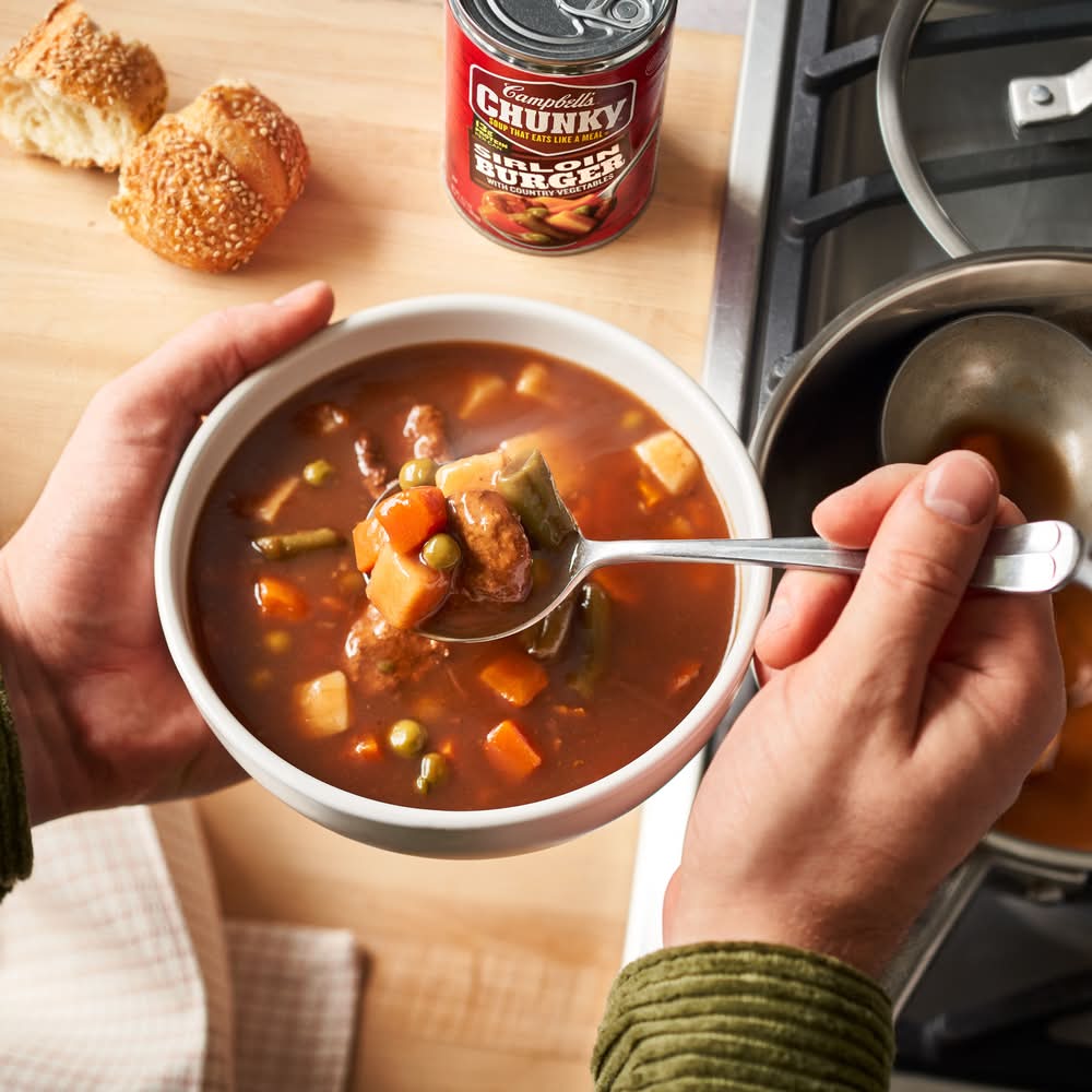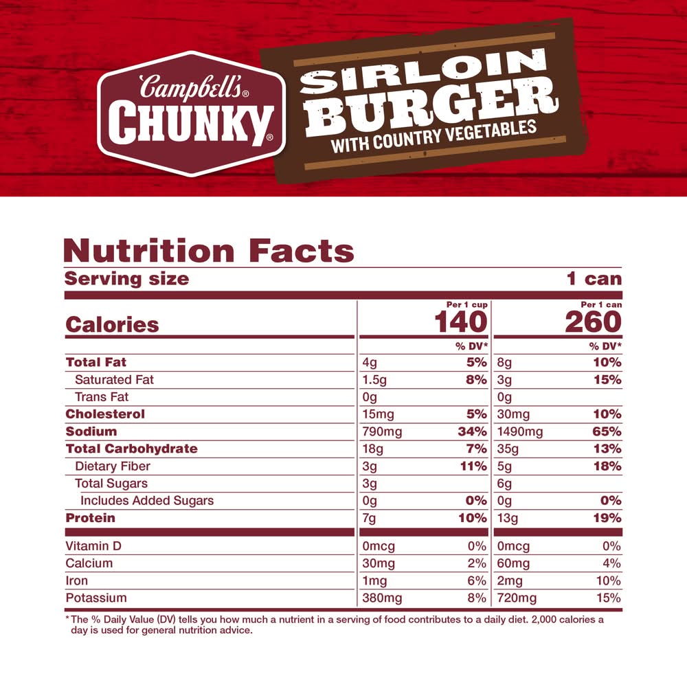 Campbell’s Chunky Sirloin Burger With Country Vegetable Beef Soup isn’t just tasty—it's made to work as hard as you do. With never-ending big flavors and bold ingredients, this canned soup is capable of fueling even the heartiest appetite. This ready-to-eat beef vegetable soup is crafted with seasoned beef, potatoes, carrots and other country vegetables for loads of flavor. Each can has 13 grams of protein. It Fills You Up Right. Just pop this ready-to-serve soup in a microwave-safe bowl, heat and enjoy with your favorite sides. Or, warm it over the campfire on your outdoor adventures. Whether you’re looking for quick and easy to microwave soup for home or something to take on the go, Campbell’s has you covered. The soup can is recyclable for easy disposal. Take on the great outdoors with Campbell’s Chunky Sirloin Burger With Country Vegetables Soup—Soup That Eats Like a Meal. • Size: 16.3 OZ • Campbell Soup Company, Camden, NJ, 08103-1701, Ph: 800-257-8443 • Packaging: Reusable