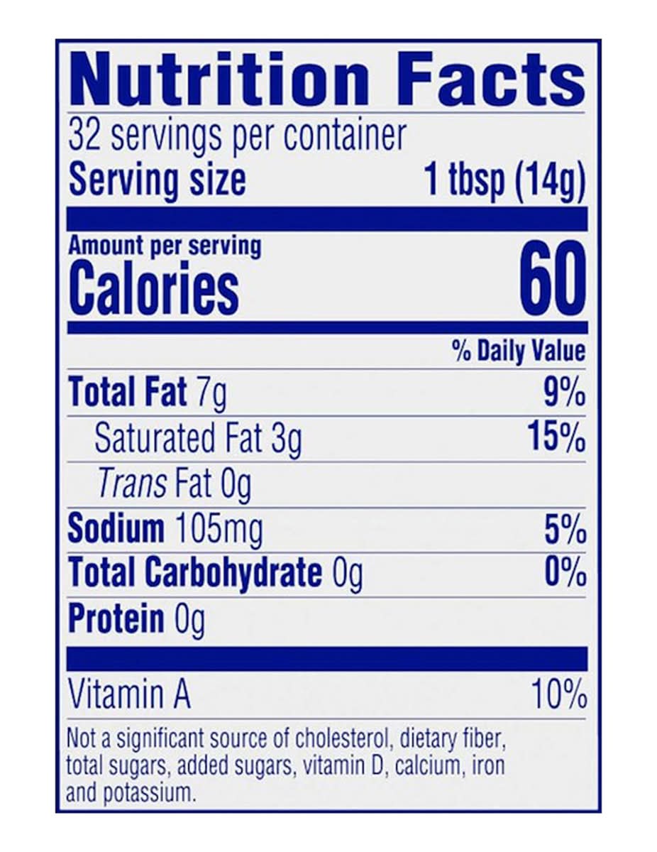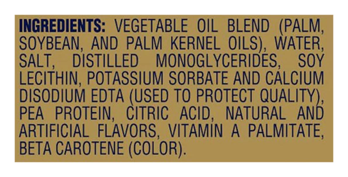 Ingredients: Water, Vegetable Oil Blend (Palm, Soybean, and Palm Kernel Oils), Salt, Distilled Monoglycerides, Soy Lecithin, Potassium Sorbate and Calcium Disodium EDTA (Used to Protect Quality), Pea Protein, Citric Acid, Natural and Artificial Flavors, Vitamin A Palmitate, Beta Carotene (Color)