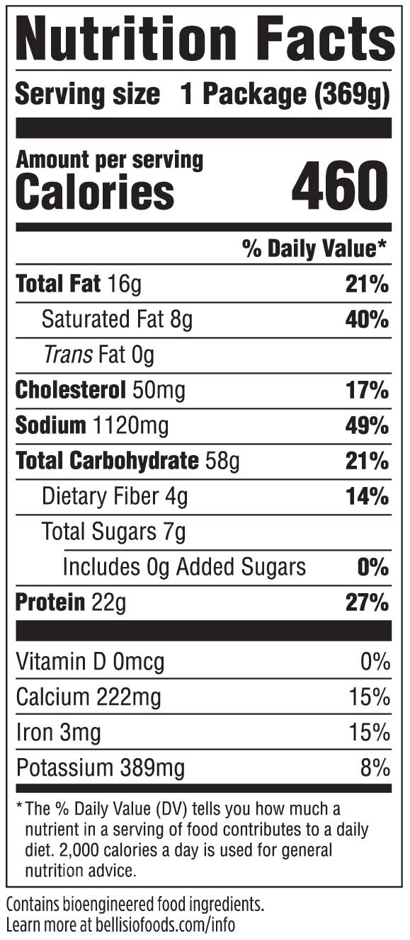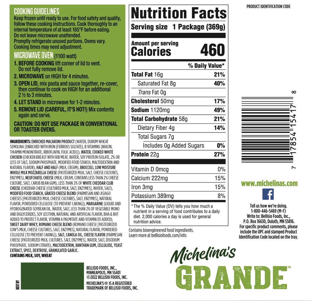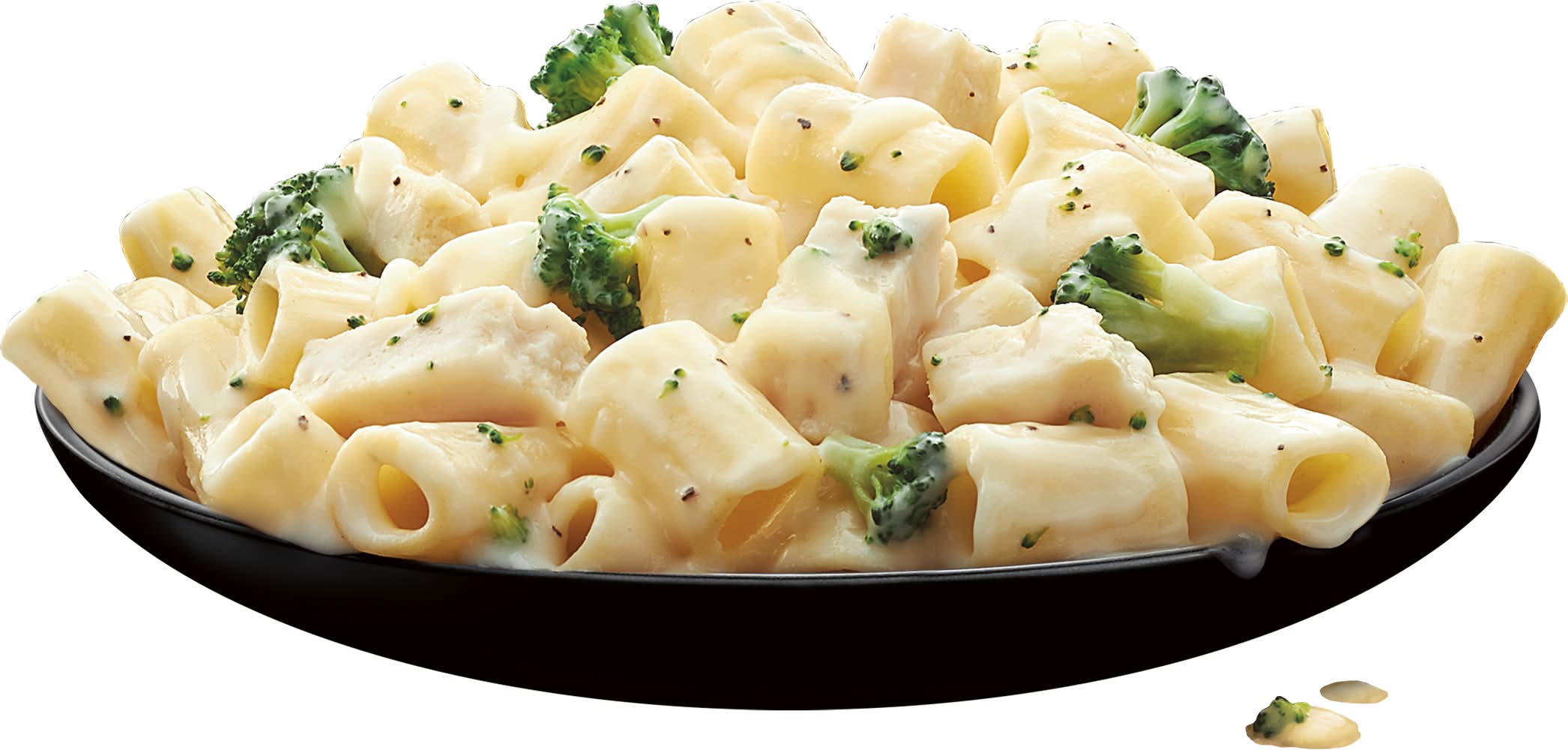 Ingredients: Enriched Macaroni Product (Water, Durum Wheat Semolina [Enriched with Iron (Ferrous Sulfate), B Vitamins (Niacin, Thiamin Mononitrate, Riboflavin, Folic Acid}]), Water, Cooked White Chicken (Chicken Breast with Rib Meat, Water, Soy Protein Isolate, 2% or Less of Salt, Sodium Phosphate, Modified Food Starch, Maltodextrin and Natural Flavor), Half and Half (Milk, Cream), Broccoli, Low Moisture Whole Milk Mozzarella Cheese (Pasteurized Milk, Salt, Cheese Cultures, Enzymes), Neufchatel Cheese (Milk, Cream, Contains Less than 2% Cheese Culture, Salt, Carob Bean Gum), Contains Less than 2% of White Cheddar Club Cheese (Cheddar Cheese [Cultured Milk, Salt, Enzymes), Water, Salt), Modified Food Starch, Grated Cheese Blend (Parmesan and Asiago Cheeses (Pasteurized Milk, Cheese Cultures, Salt, Enzymes], Natural Flavor, Powdered Cellulose [to Prevent Caking)), Margarine (Liquid and Hydrogenated Soybean Oil, Water, Salt, Less than 2% of Vegetable Mono and Diglycerides, Soy Lecithin, Natural and Artificial Flavor, BHA & BHT Added to Protect Flavor, Vitamin A Palmitate and Vitamin D3 Added), Sweet Dairy Whey, Romano Cheese Blend (Romano Cheese [Pasteurized Cow's Milk, Cheese Cultures, Salt, Enzymes], Natural Flavor, Powdered Cellulose [to Prevent Caking)), Salt, Canola Oil, Cheese Flavor (Parmesan Cheese [Pasteurized Milk, Cultures, Salt, Enzymes], Water, Salt, Disodium Phosphate, Sodium Citrate), Maltodextrin, Xanthan Gum, Cellulose, Yeast Extract, Spice, Dextrose, Granulated Garlic. Contains: Milk, Soybeans, Wheat