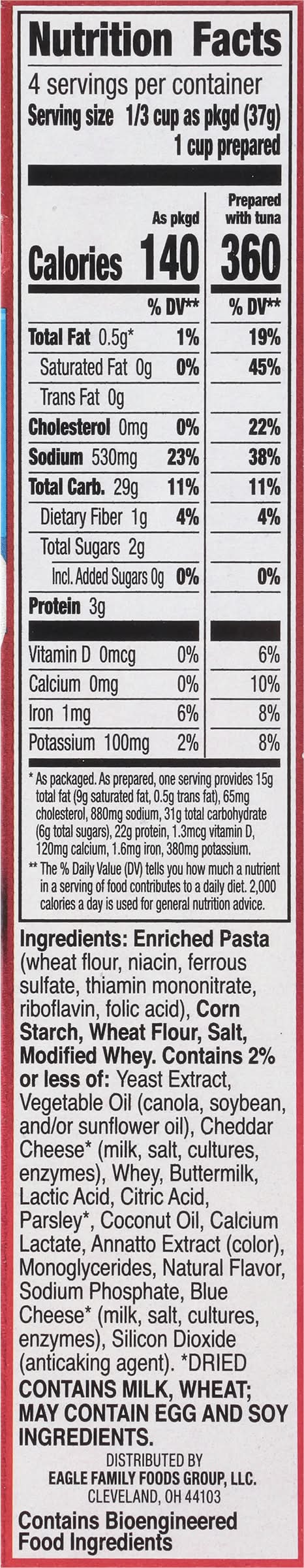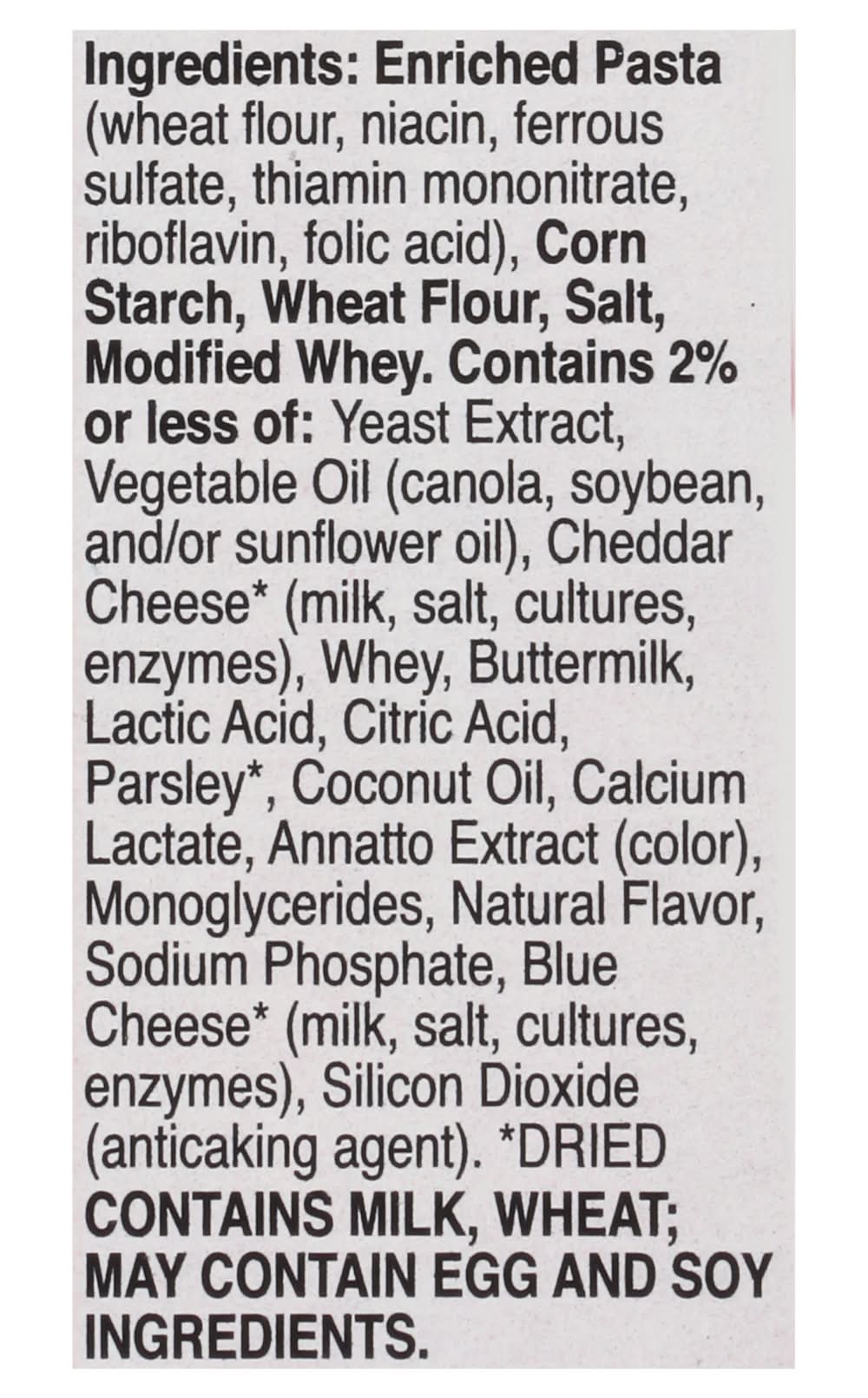 Ingredients: Enriched Pasta (Wheat Flour, Niacin, Ferrous Sulfate, Thiamin Mononitrate, Riboflavin, Folic Acid), Corn Starch, Wheat Flour, Salt, Modified Whey, Contains 2% or Less of: Yeast Extract, Vegetable Oil (Canola, Soybean, and/or Sunflower Oil), Cheddar Cheese (Dried) (Milk, Salt, Cultures, Enzymes), Whey, Buttermilk, Lactic Acid, Citric Acid, Parsley (Dried), Coconut Oil, Calcium Lactate, Annatto Extract (Color), Monoglycerides, Natural Flavor, Sodium Phosphate, Blue Cheese (Dried) (Milk, Salt, Cultures, Enzymes), Silicon Dioxide (Anticaking Agent) Contains: Milk, Wheat, Corn, Soybeans, Tree Nuts, Coconuts, Eggs, Soybeans