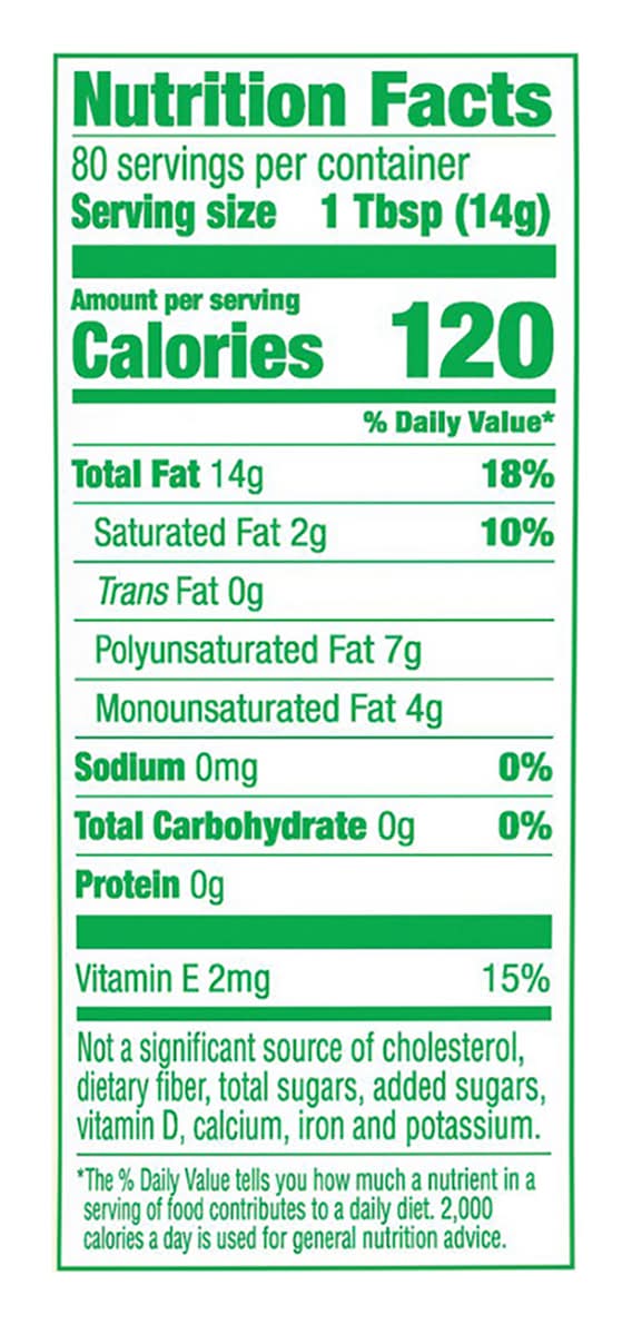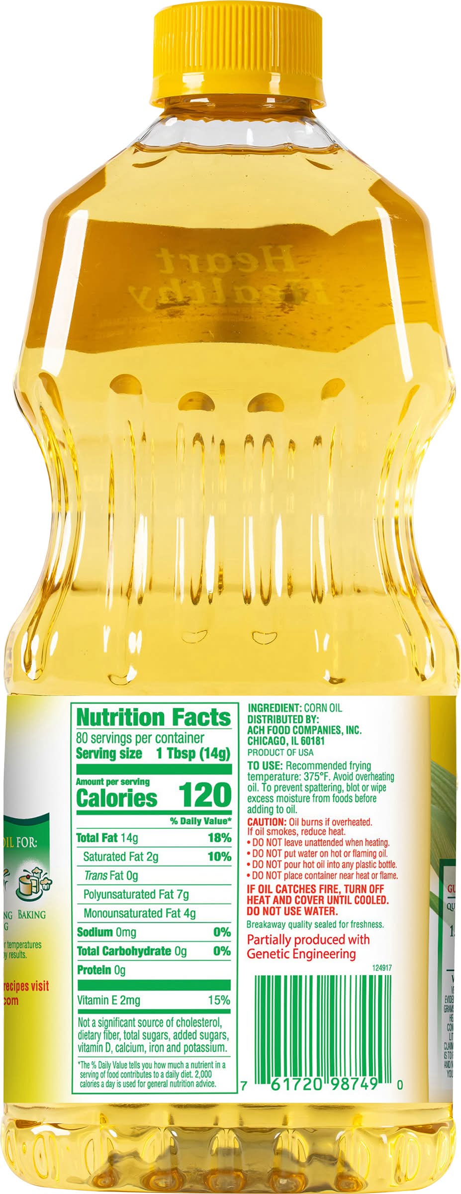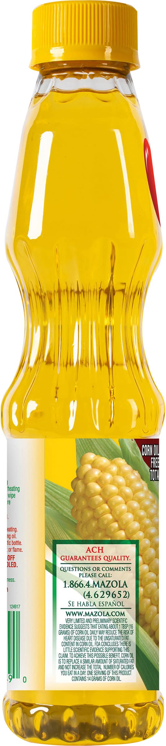 Corn oil is a cholesterol free food with 14g of total fat per serving Very limited and preliminary scientific evidence suggests that eating about 1 tbsp (16 grams) of corn oil daily may reduce the risk of heart disease due to the unsaturated fat content in corn oil. FDA concludes there is little scientific evidence supporting this claim. To achieve this possible benefit, corn oil is to replace a similar amount of saturated fat and not increase the total number of calories you eat in a day. One serving of this product contains 14 grams of corn oil. • Size: 40 OZ • Ach food, Chicago, IL 60181