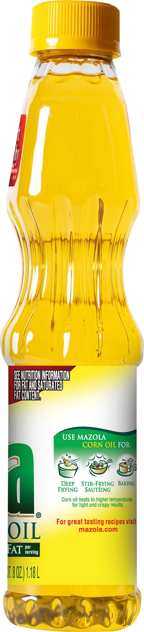 To use: recommended frying temperature: 375 degrees f. avoid overheating oil. to prevent spattering, blot or wipe excess moisture from foods before adding to oil. breakaway quality sealed for freshness. use mazola corn oil for: deep frying; stir-frying sauteing; baking. corn oil heats to higher temperature for light and crispy results. use mazola olive oil for: pasta; stir-frying sauteing; salads.