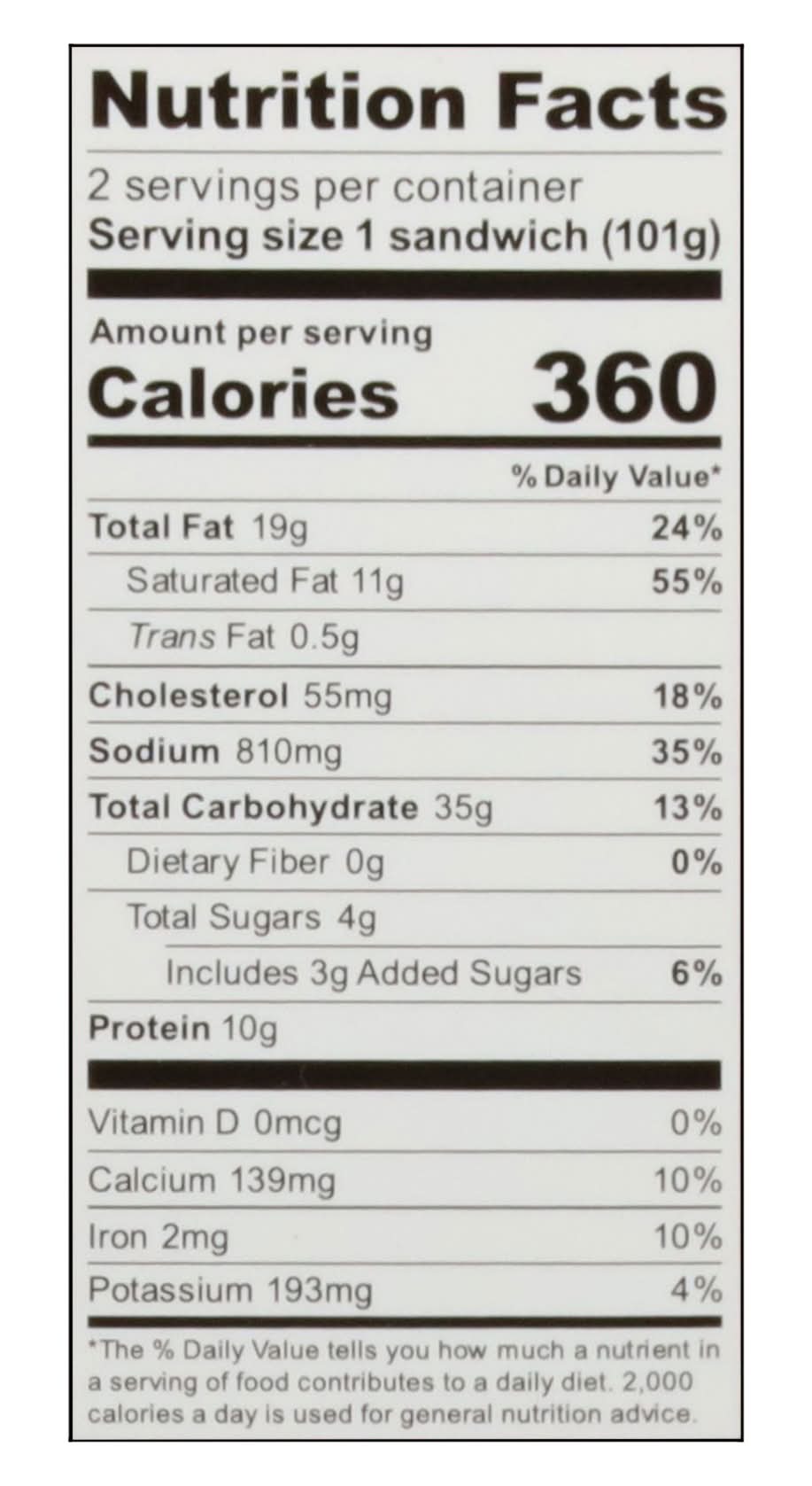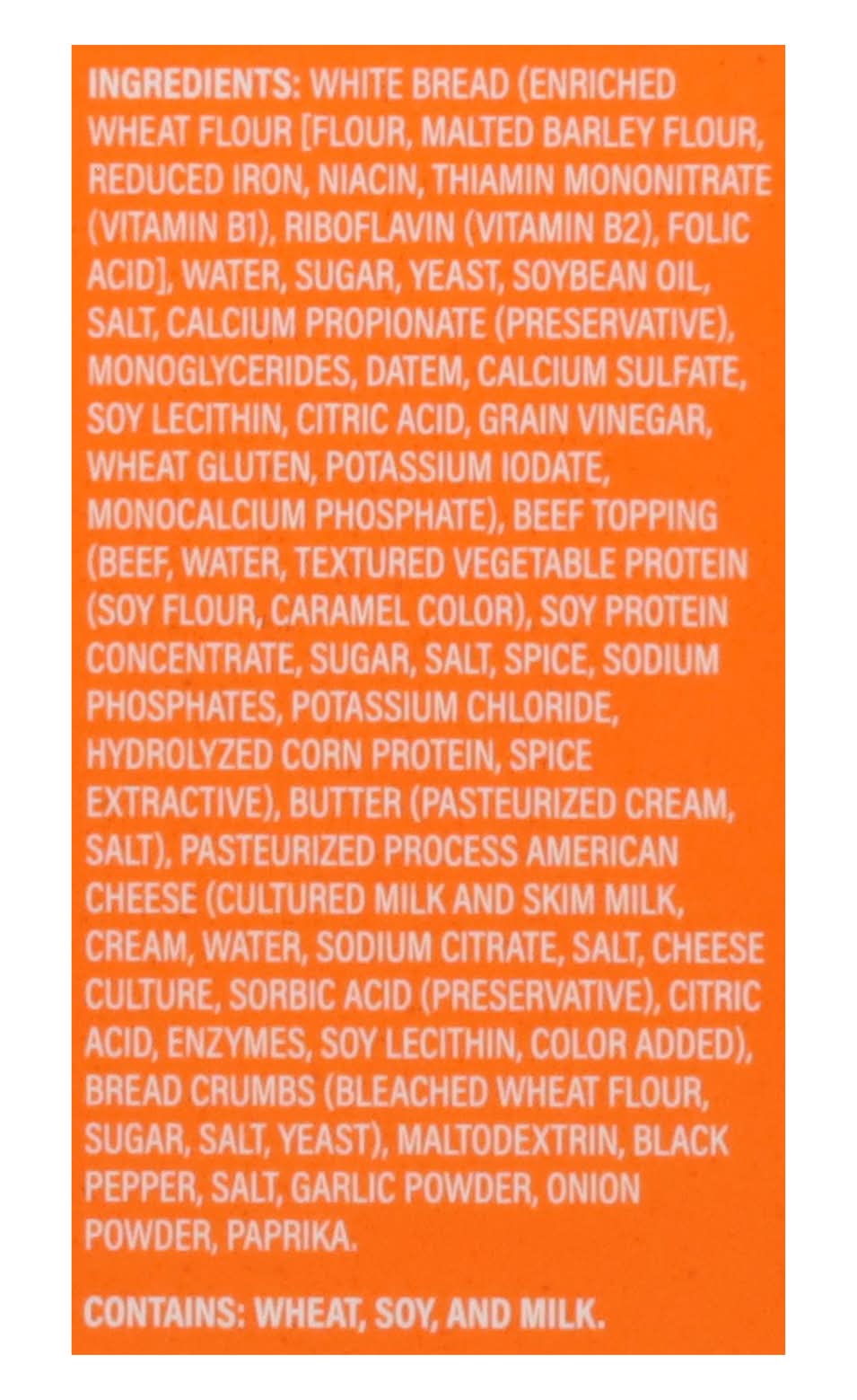 Ingredients: White Bread (Enriched Wheat Flour [Flour, Malted Barley Flour, Reduced Iron, Niacin, Thiamin Mononitrate (Vitamin B1), Riboflavin (Vitamin B2), Folic Acid], Water, Sugar, Yeast, Soybean Oil, Salt, Calcium Propionate (Preservative), Monoglycerides, DATEM, Calcium Sulfate, Soy Lecithin, Citric Acid, Grain Vinegar, Wheat Gluten, Potassium Iodate, Monocalcium Phosphate), Beef Topping (Beef, Water, Textured Vegetable Protein (Soy Flour, Caramel Color), Soy Protein Concentrate, Sugar, Salt, Spice, Sodium Phosphates, Potassium Chloride, Hydrolyzed Corn Protein, Spice Extractive), Butter (Pasteurized Cream, Salt), Pasteurized Process American Cheese (Cultured Milk and Skim Milk, Cream, Water, Sodium Citrate, Salt, Cheese Culture, Sorbic Acid (Preservative), Citric Acid, Enzymes, Soy Lecithin, Color Added), Bread Crumbs (Bleached Wheat Flour, Sugar, Salt, Yeast), Maltodextrin, Black Pepper, Salt, Garlic Powder, Onion Powder, Paprika Contains: Wheat, Soybeans, Milk, Barley, Gluten