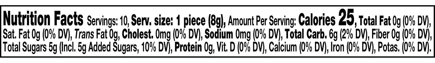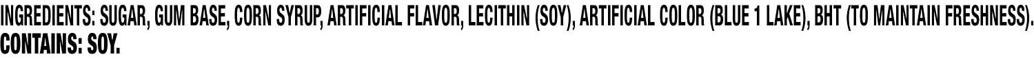 Ingredients: SUGAR, GUM BASE, CORN SYRUP, ARTIFICIAL FLAVOR, LECITHIN (SOY), ARTIFICIAL COLOR (BLUE 1 LAKE), BHT (TO MAINTAIN FRESHNESS), . Contains: Contains: Soy
